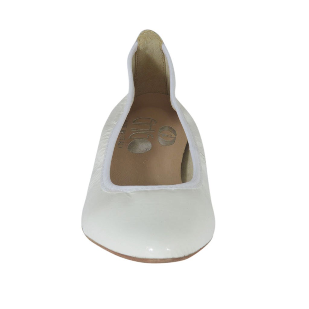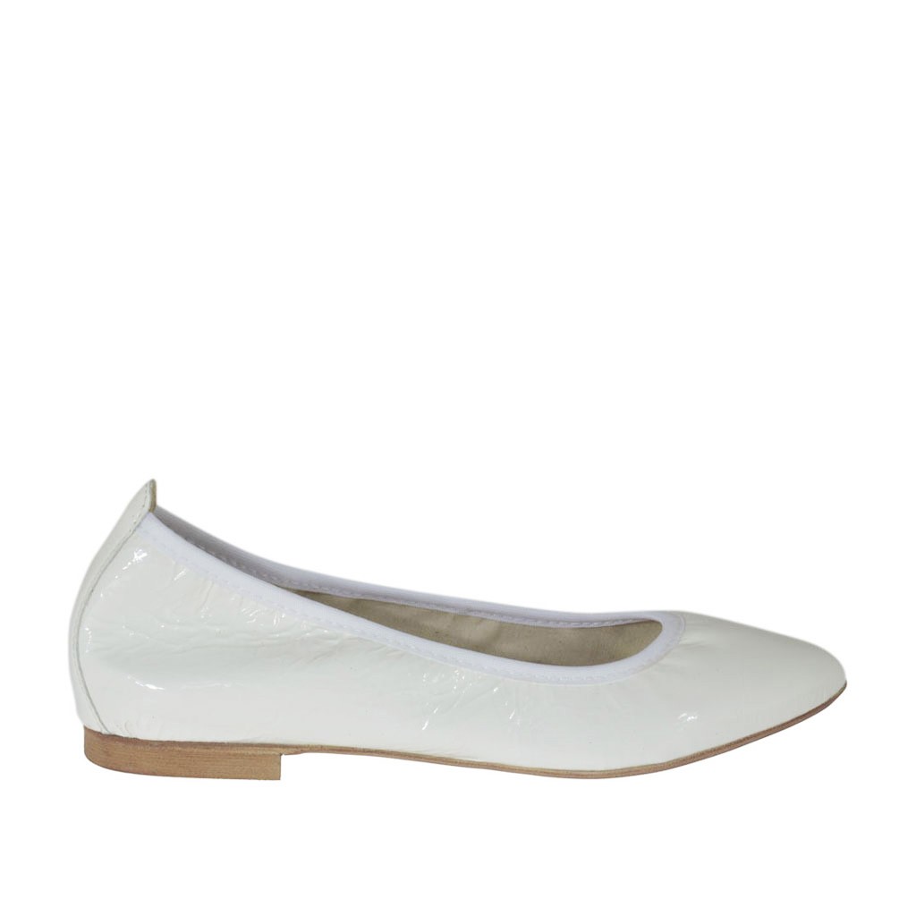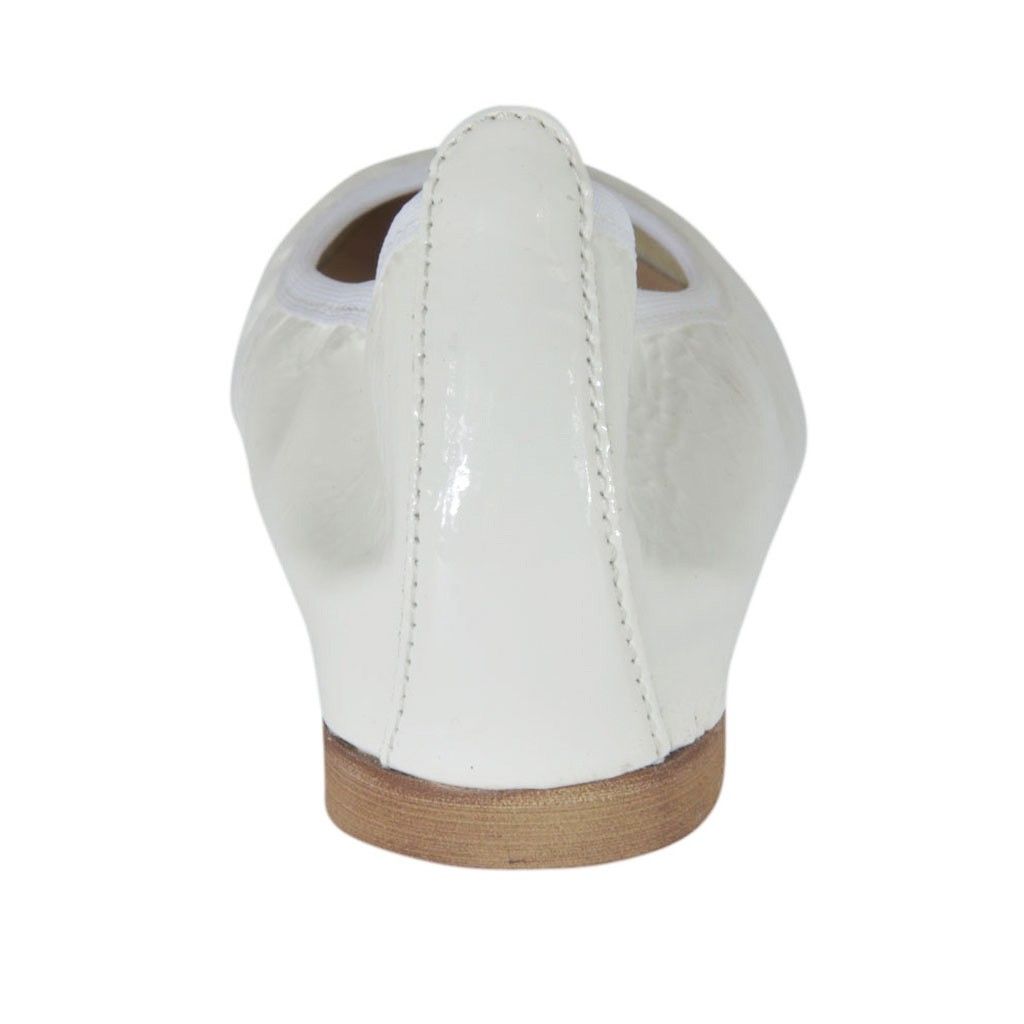 Spitzer Ballerinaschuh für Damen, 1 cm. hoher Absatz, aus weissem Lackleder, Gummisohle, Stofffutter. Erhältlich in kleinen und großen Größen.
