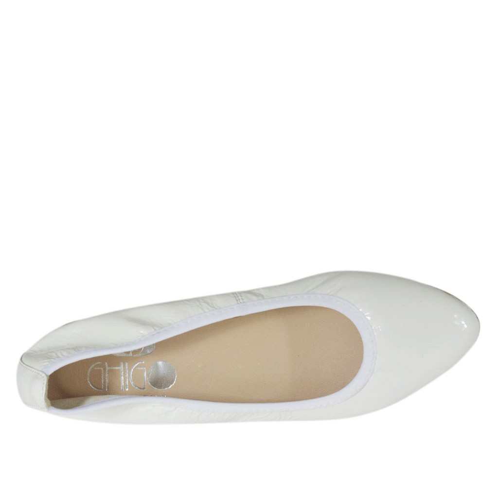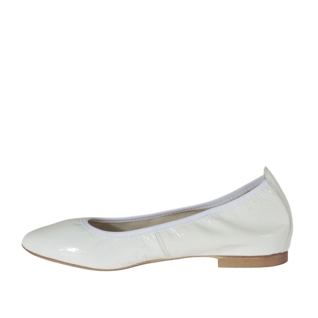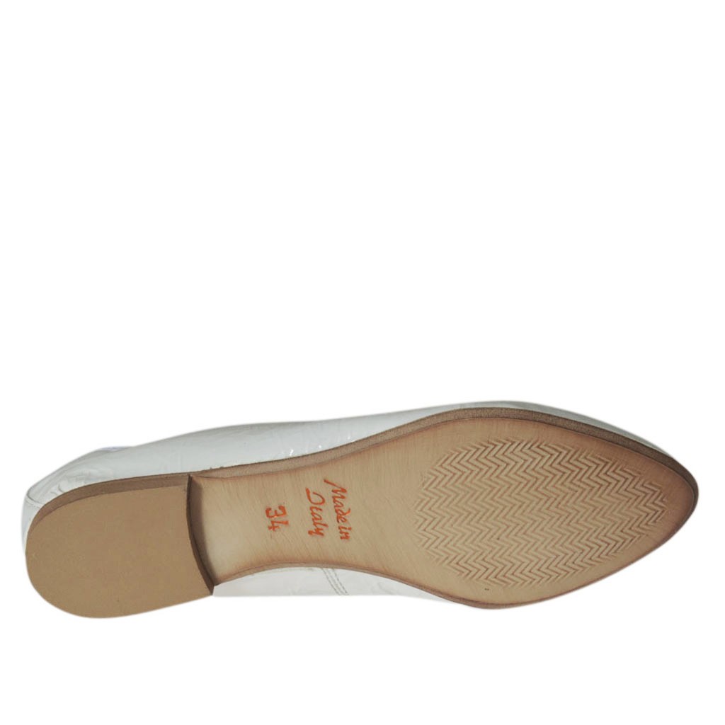Spitzer Ballerinaschuh für Damen, 1 cm. hoher Absatz, aus weissem Lackleder, Gummisohle, Stofffutter. Erhältlich in kleinen und großen Größen.