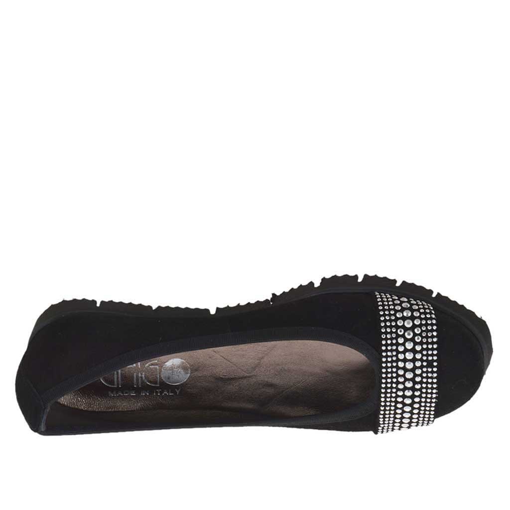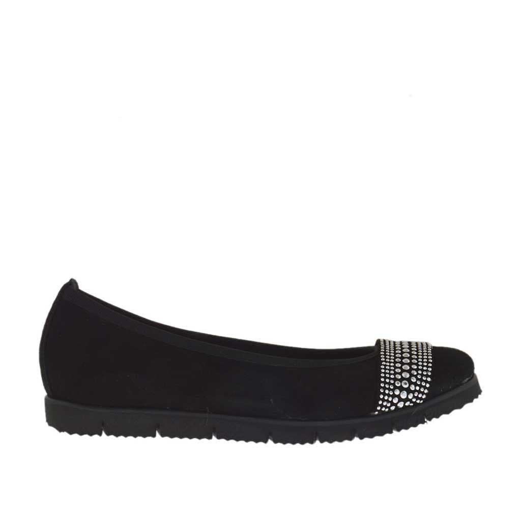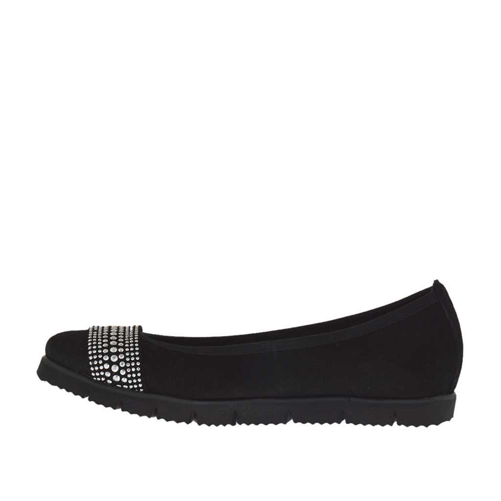 Ballerinaschuh für Damen mit Strass, 2 cm. hoher Keilabsatz, aus schwarzem Wildleder, Gummisohle, Lederfutter. Erhältlich in kleinen und großen Größen.