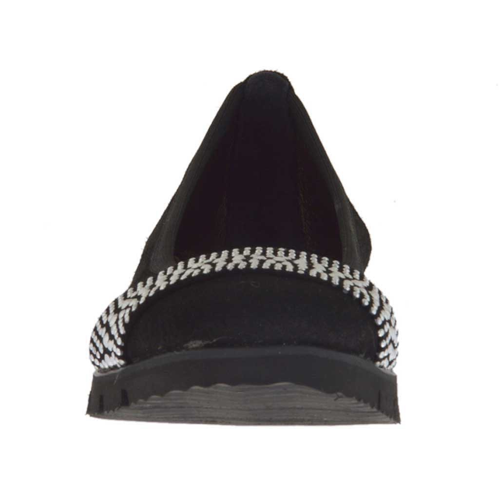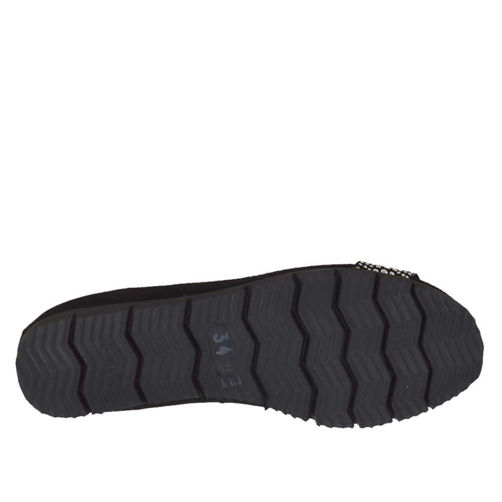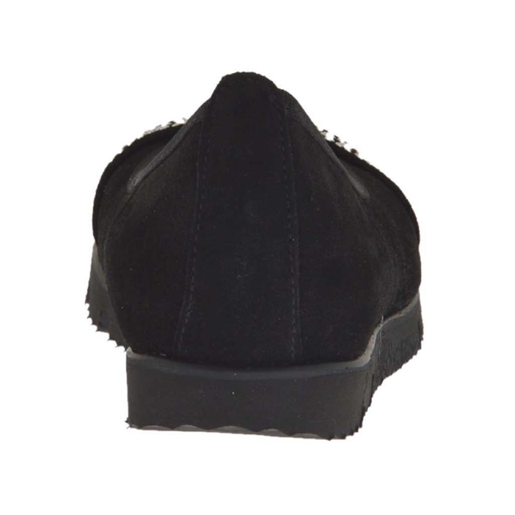 Ballerinaschuh für Damen mit Strass, 2 cm. hoher Keilabsatz, aus schwarzem Wildleder, Gummisohle, Lederfutter. Erhältlich in kleinen und großen Größen.