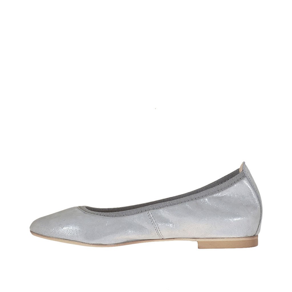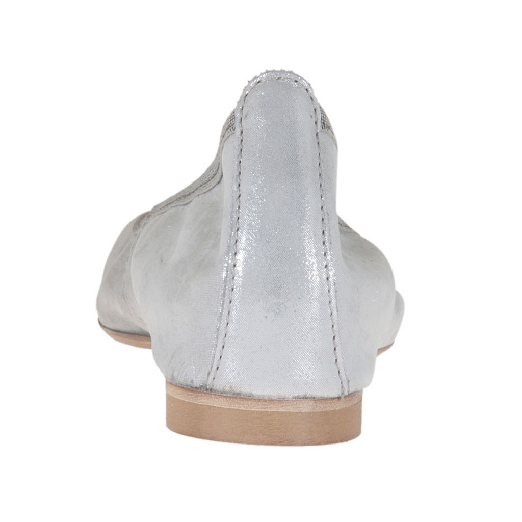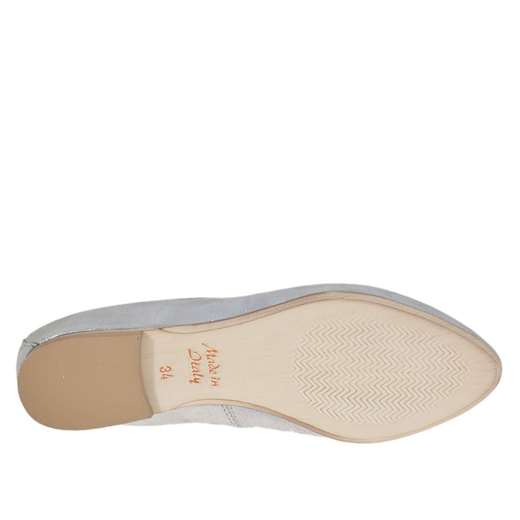 Ballerinaschuh mit spitzer Spitze für Damen, 1 cm. hoher Absatz, aus laminiertem silberfarbenem bezogenem Wildleder, Gummisohle, Lederfutter.Erhältlich in kleinen und großen Größen.