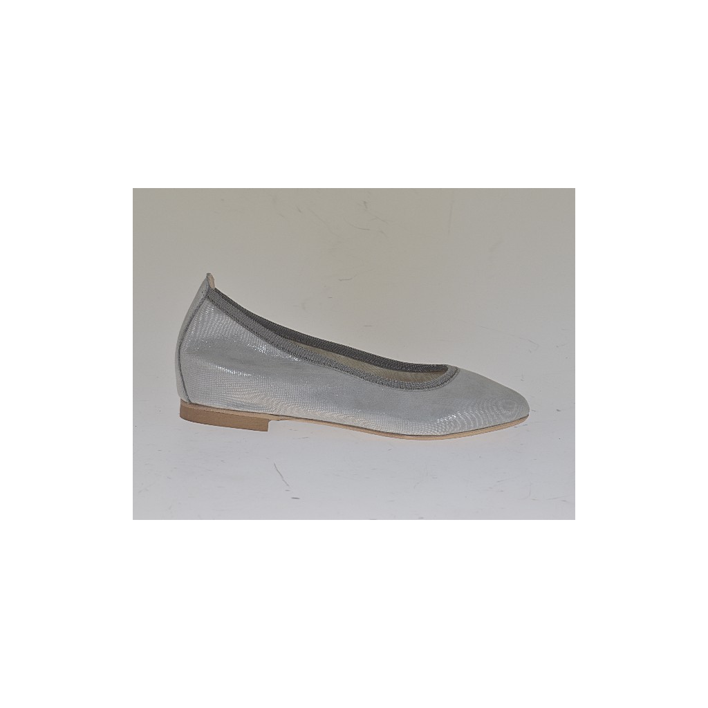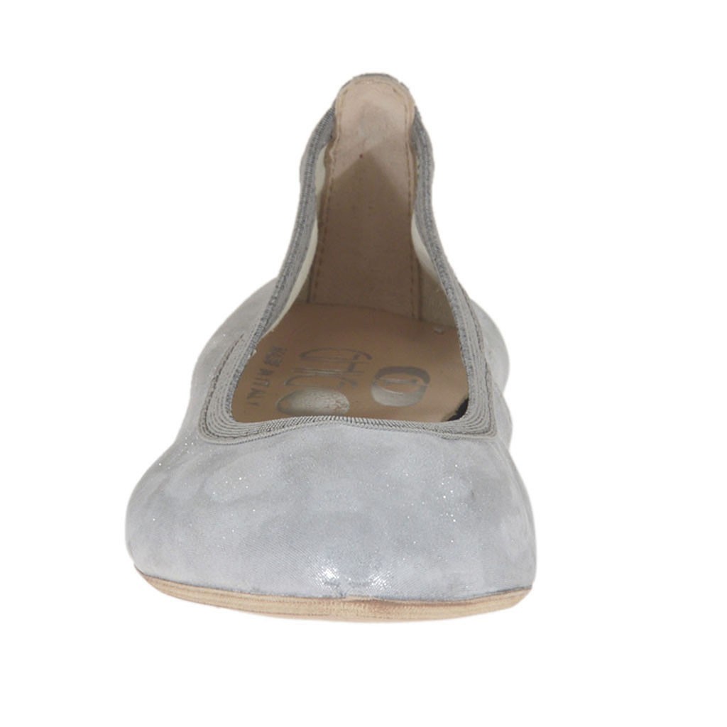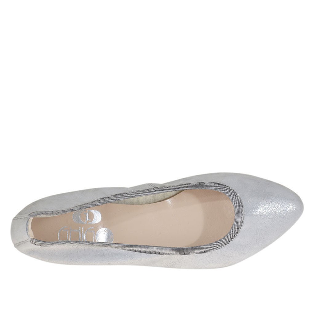 Ballerinaschuh mit spitzer Spitze für Damen, 1 cm. hoher Absatz, aus laminiertem silberfarbenem bezogenem Wildleder, Gummisohle, Lederfutter.Erhältlich in kleinen und großen Größen.
