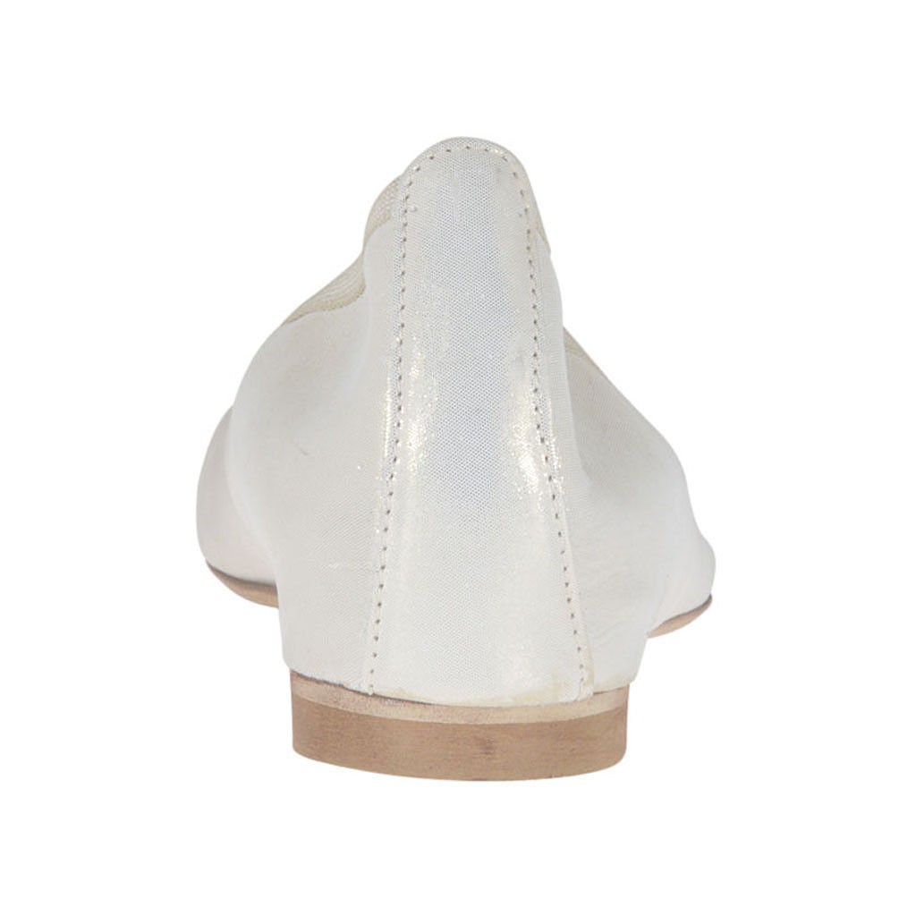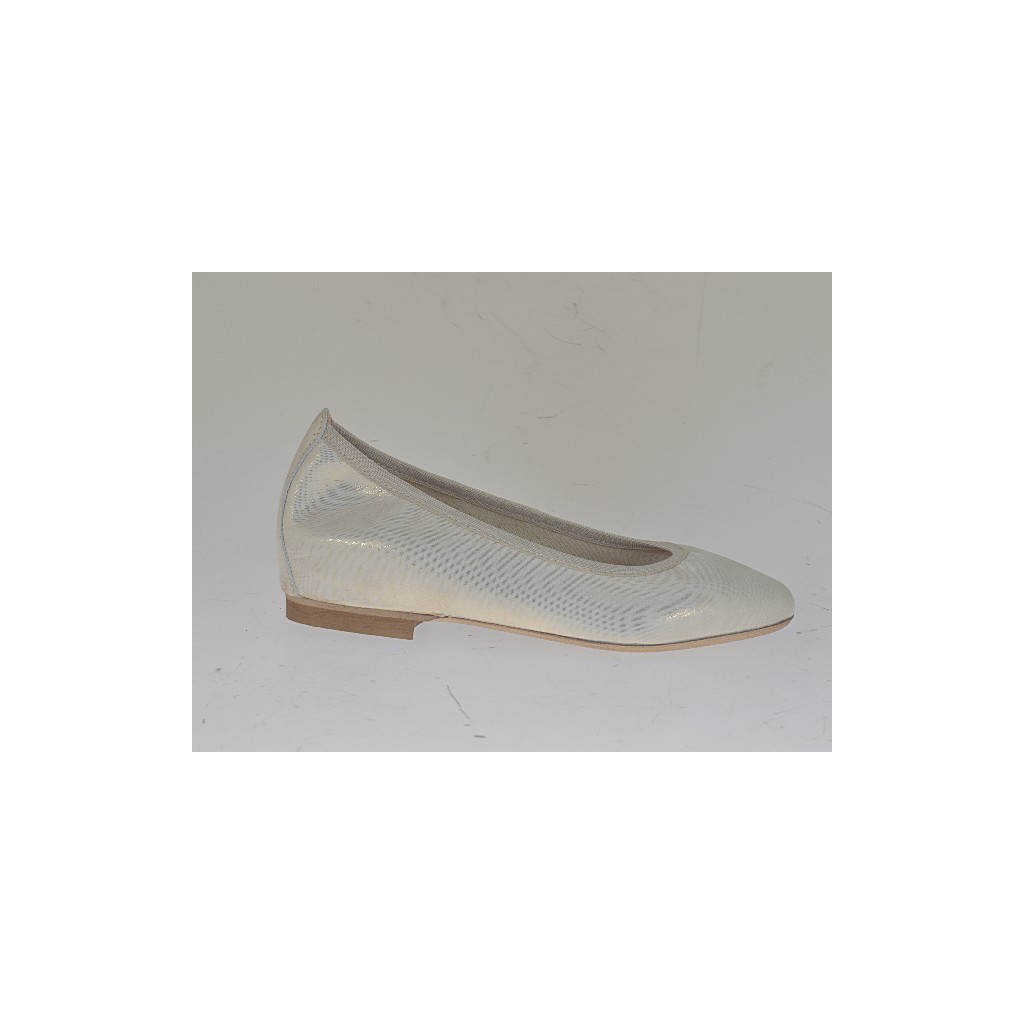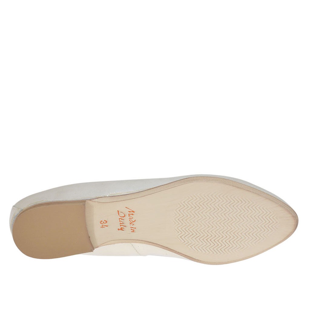 Ballerinaschuh mit spitzer Spitze für Damen, 1 cm. hoher Absatz, aus laminiertem platinfarbenem bezogenem Wildleder, Gummisohle, Lederfutter.Erhältlich in kleinen und großen Größen.