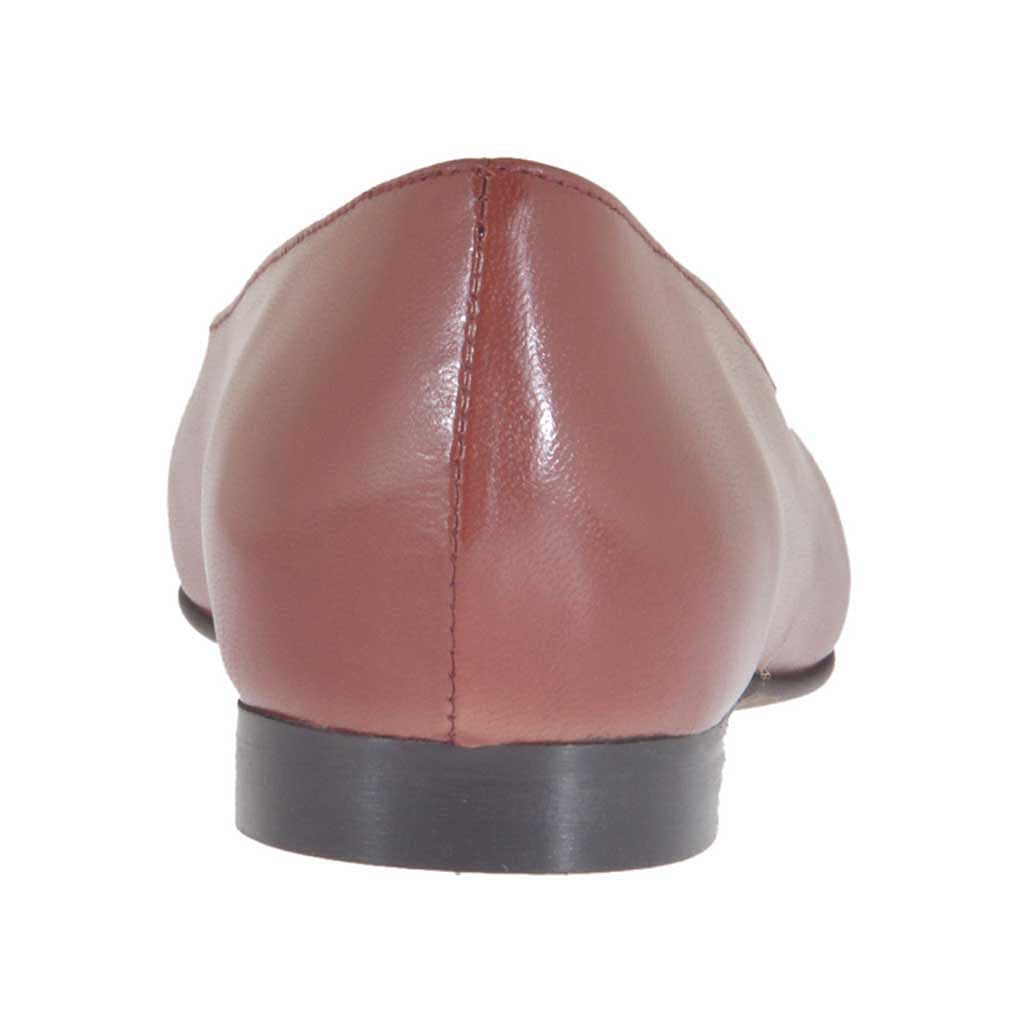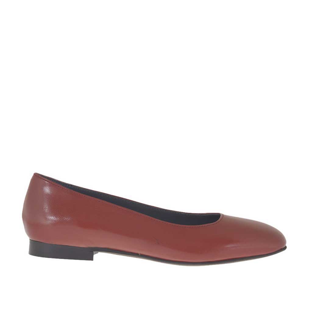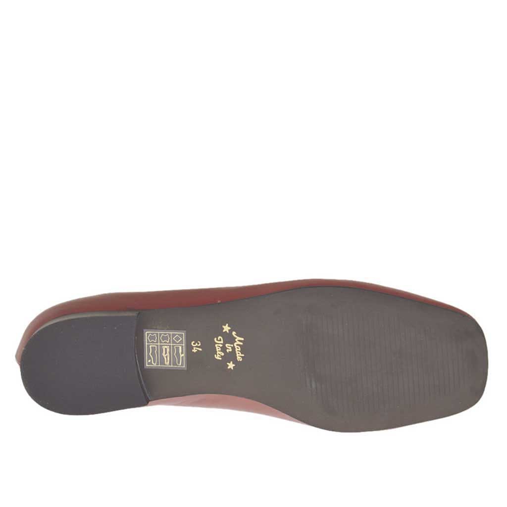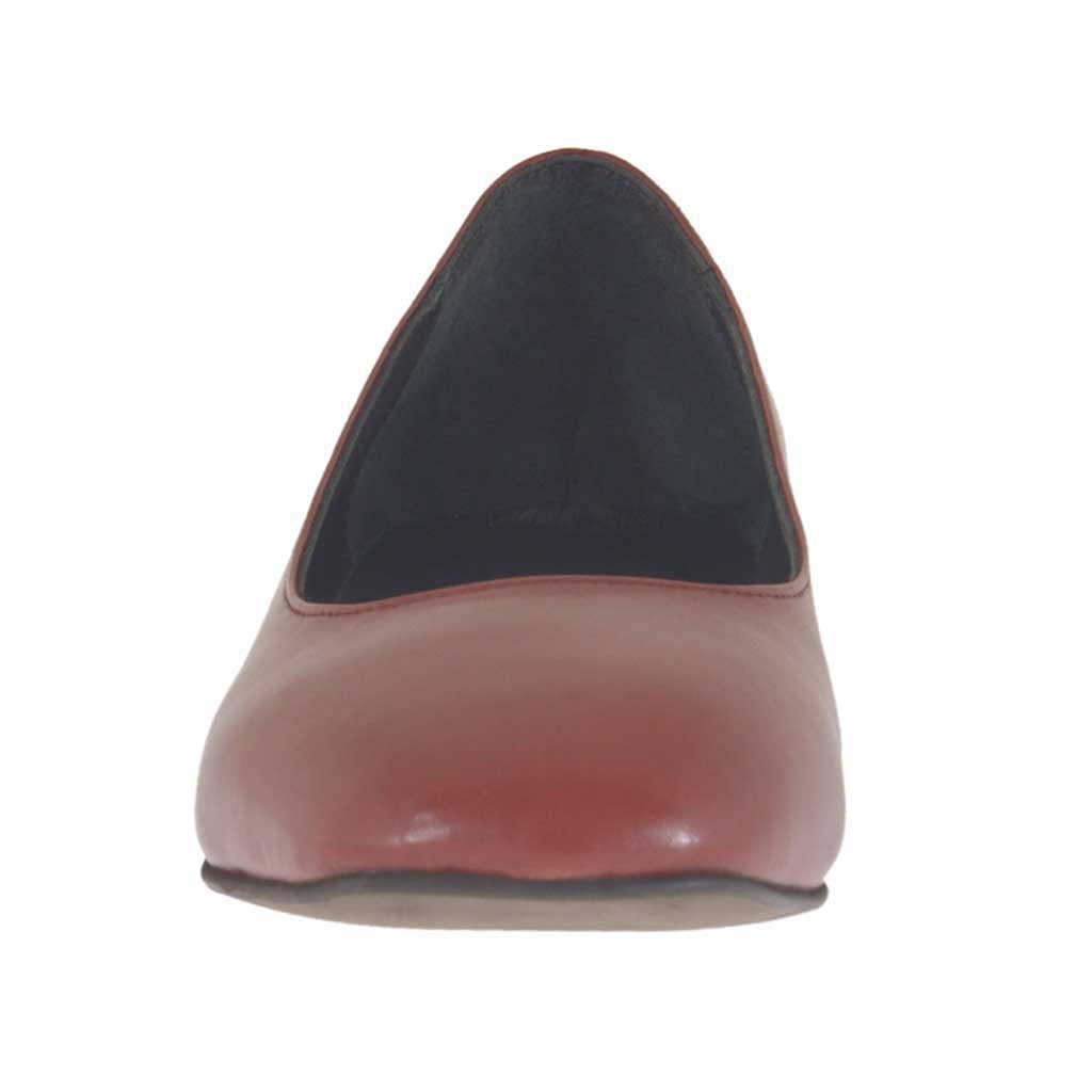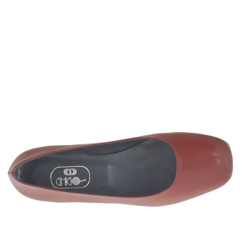 Ballerinaschuh für Damen mit quadrater Spitze, 1 cm. hoher Absatz, aus backsteinrotem Leder, Gummisohle, Lederfutter. Erhältlich in kleinen und großen Größen.