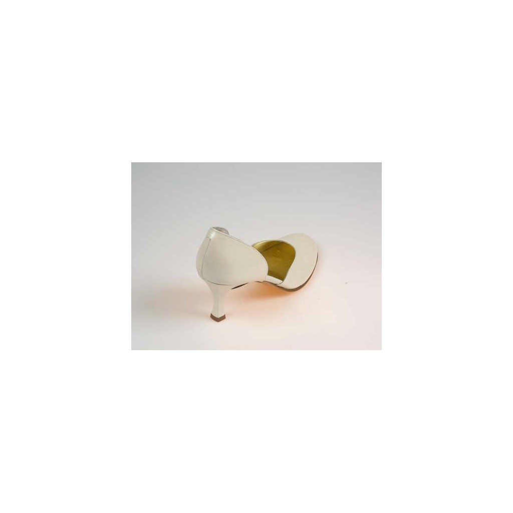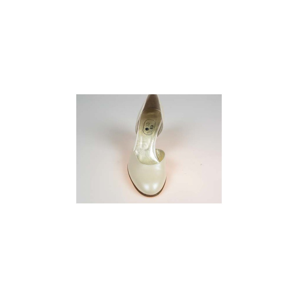 Offener Dekollet?, 7 cm. hohe Absatz, aus elfenbeinfarbigem metalisiertem Leder, mit Lederfutter.