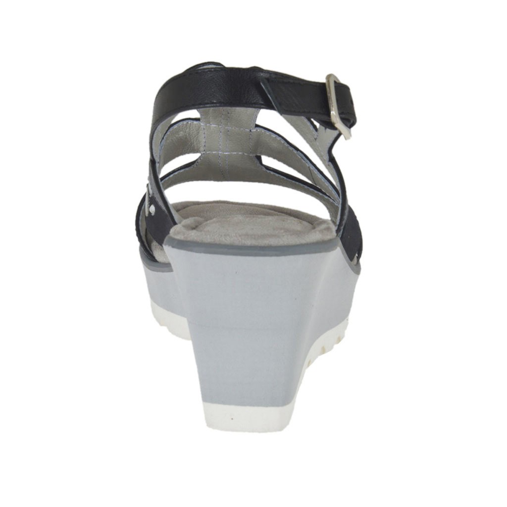 Damensandale mit Strasssteinen, 6 cm. hoher Keilabsatz und 2 cm. hohes Plateau, aus schwarzem Leder und Nubukleder, Gummisohle, Lederfutter. Erhältlich in kleinen und großen Größen.