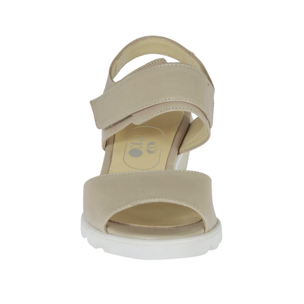 Damensandale mit Klettverschluss, 4 cm. hoher Keilabsatz, aus puderrosafarbenem Leder, Gummisohle, Lederfutter. Erhältlich in kleinen und großen Größen.