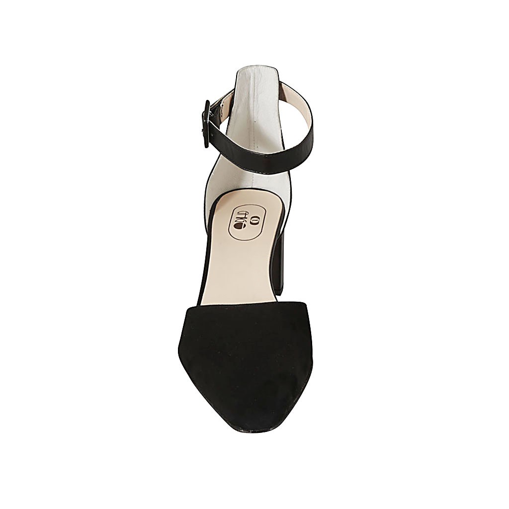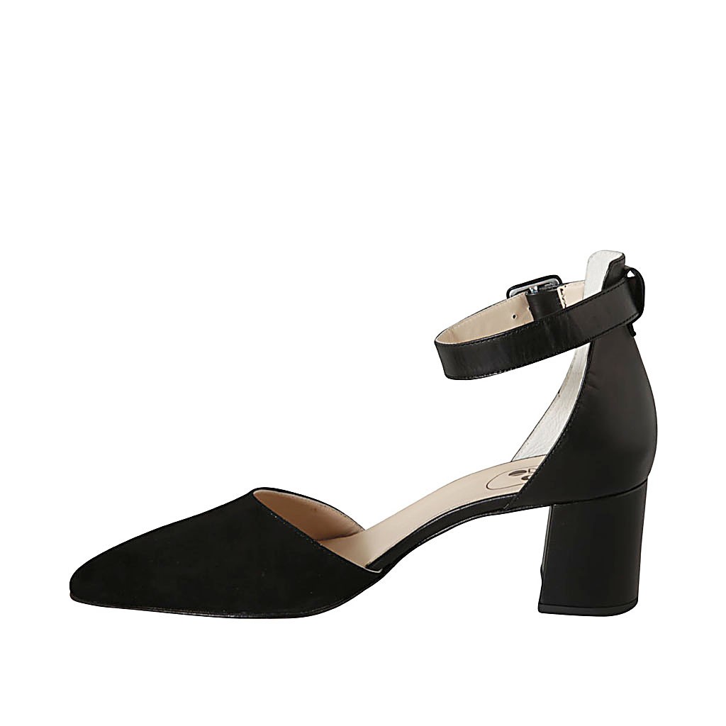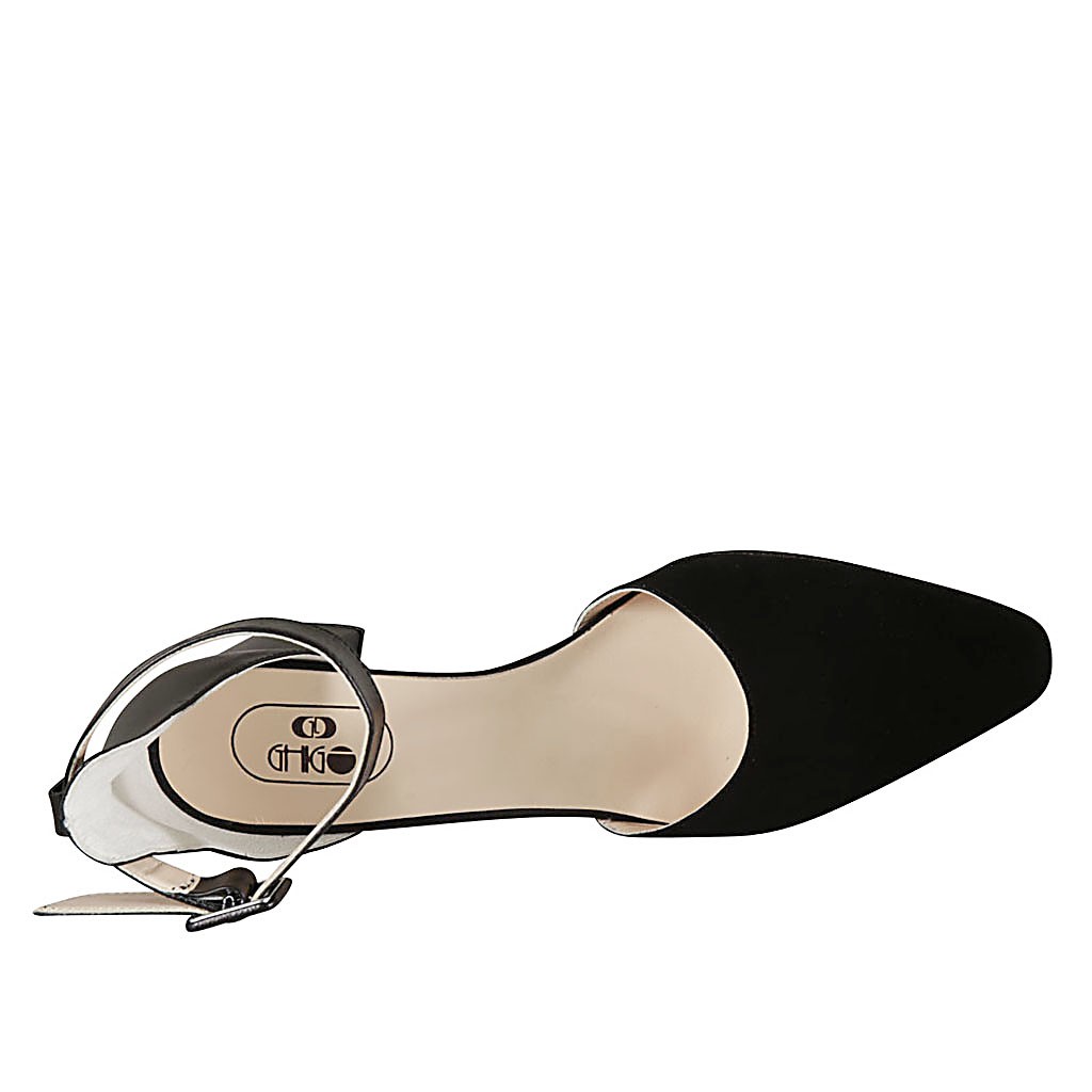 Offener spitzer Damenschuh mit Knöchelriemen aus schwarzem Leder und Wildleder Absatz 7