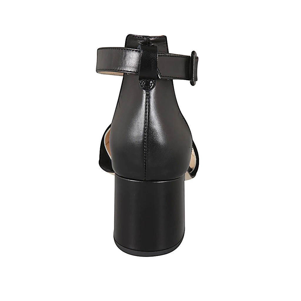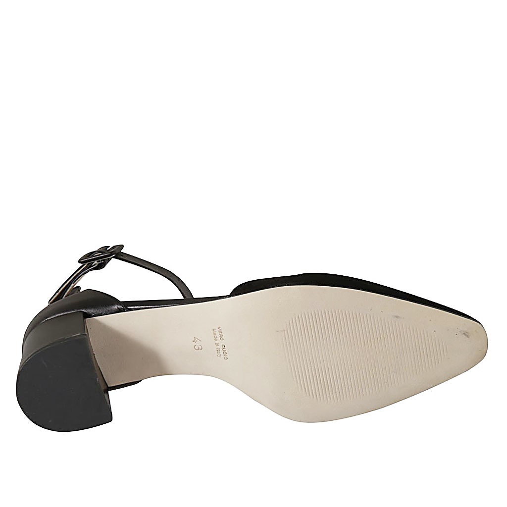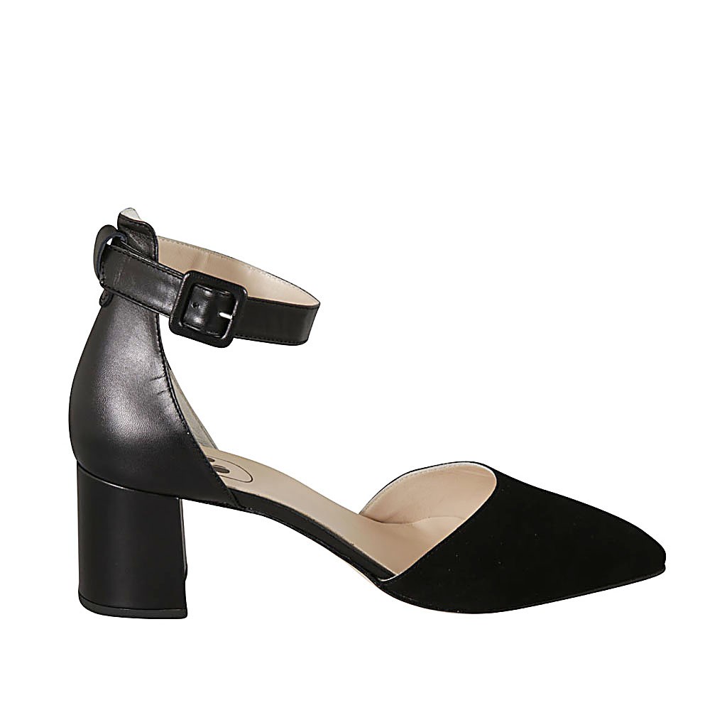 Offener spitzer Damenschuh mit Knöchelriemen aus schwarzem Leder und Wildleder Absatz 7