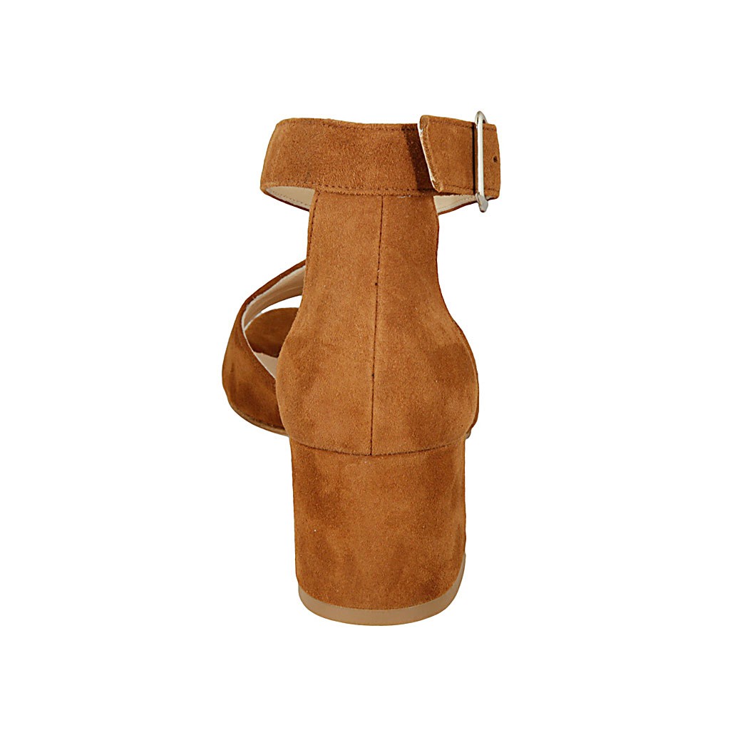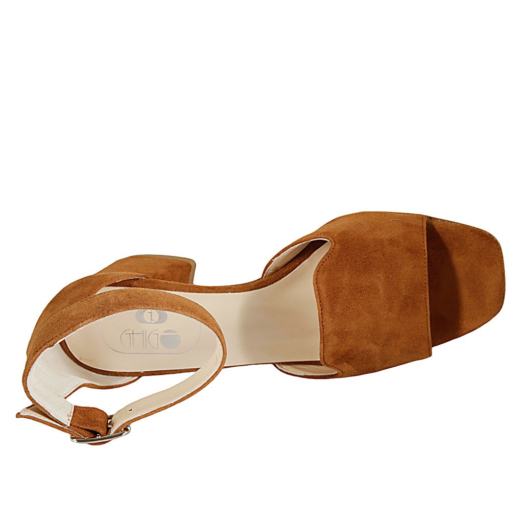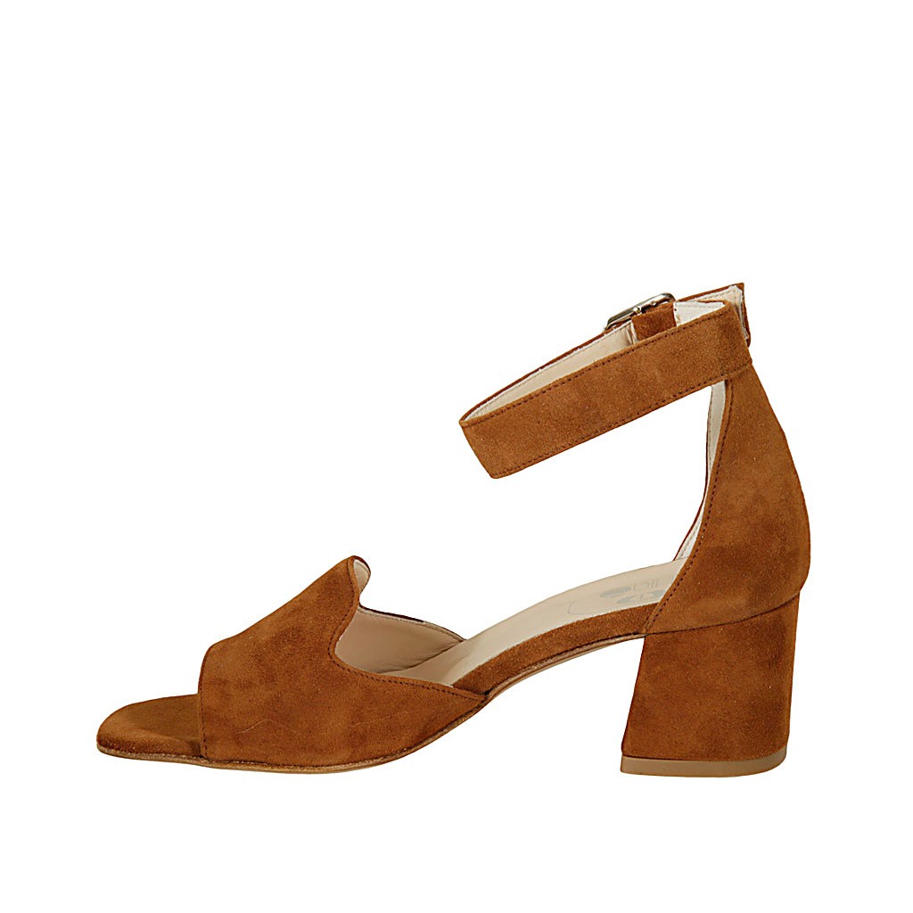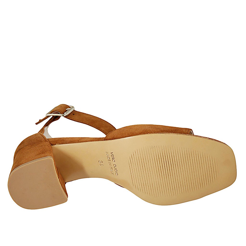Offener Damenschuh mit Riem aus hellbraunem Wildleder Absatz 6