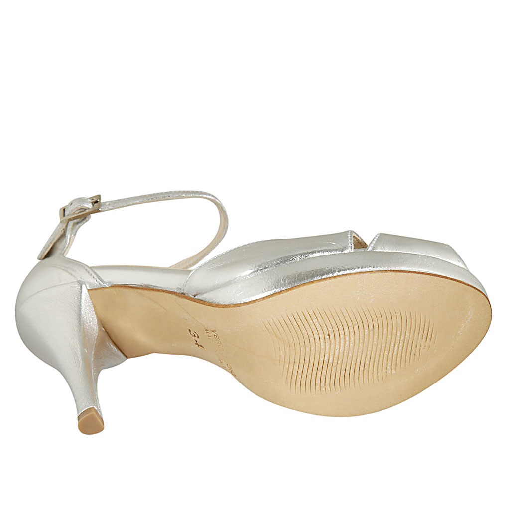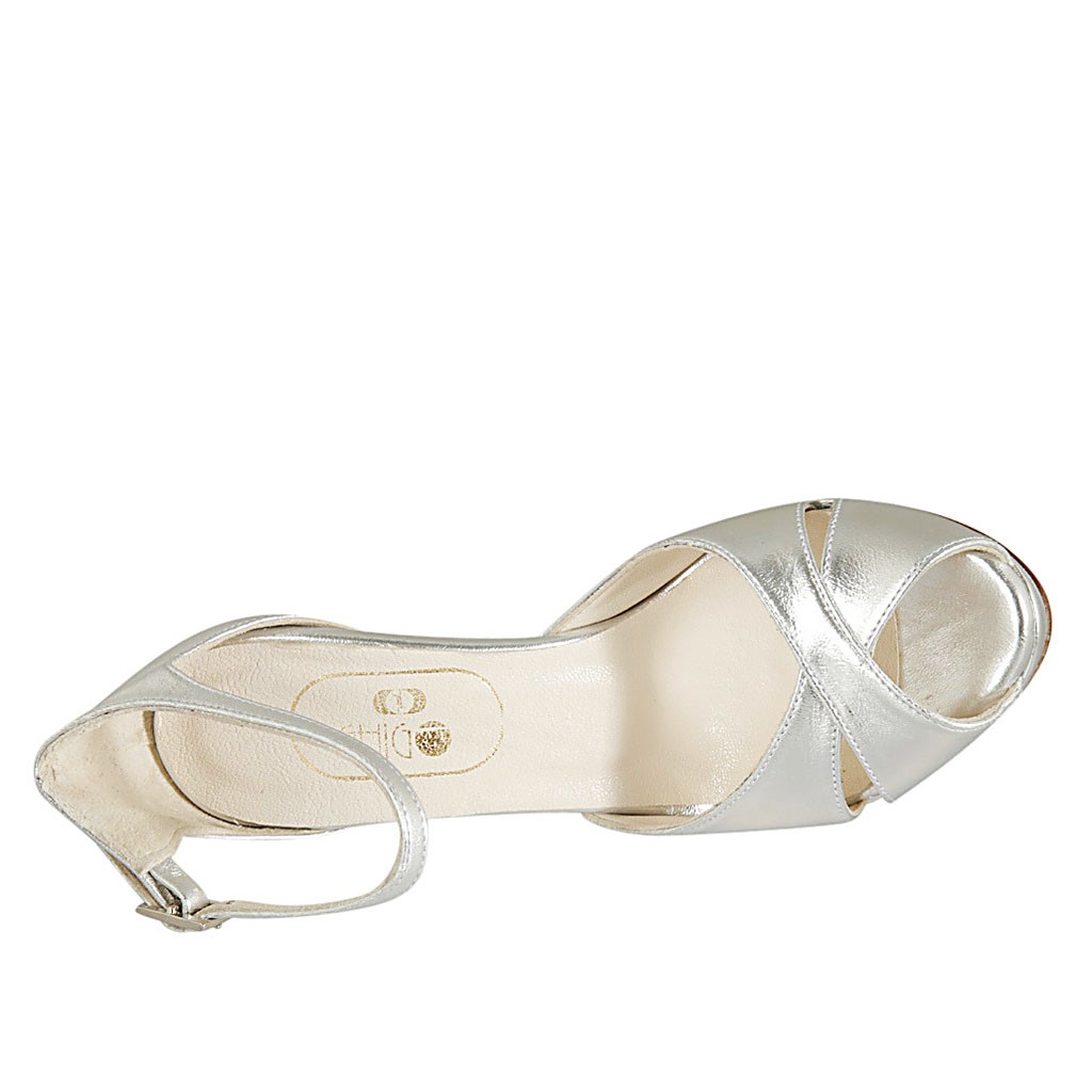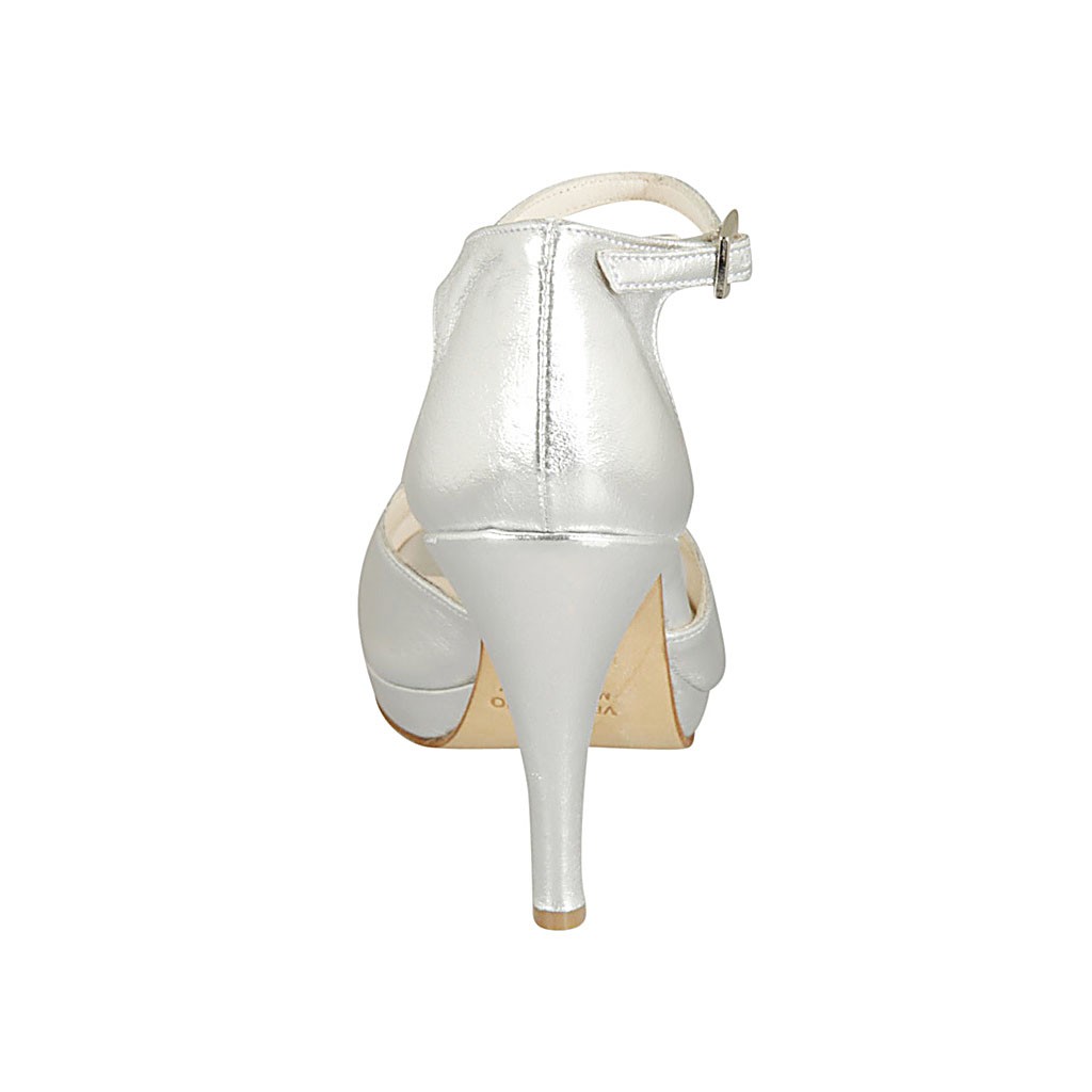 Offener Damenschuh mit Plateau und Riem aus silbernem laminiertem Leder Absatz 9