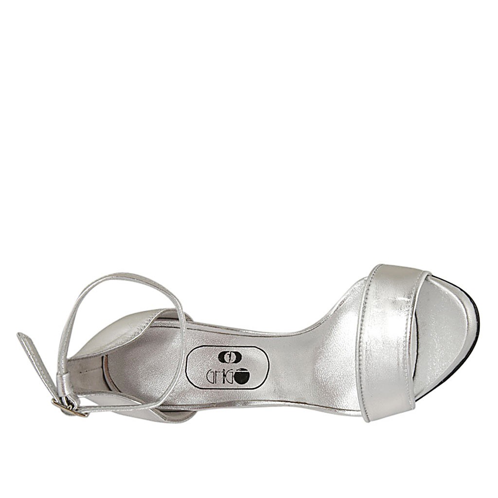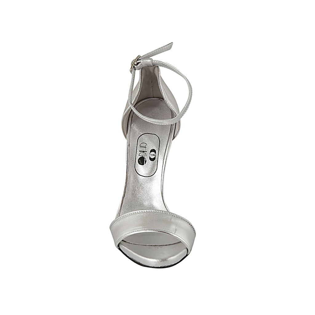 Offener Damenschuh mit Riem aus silberfarbenem laminiertem Leder Absatz 11