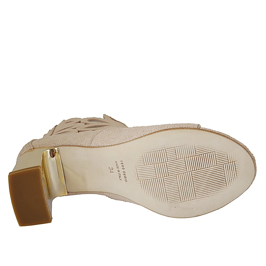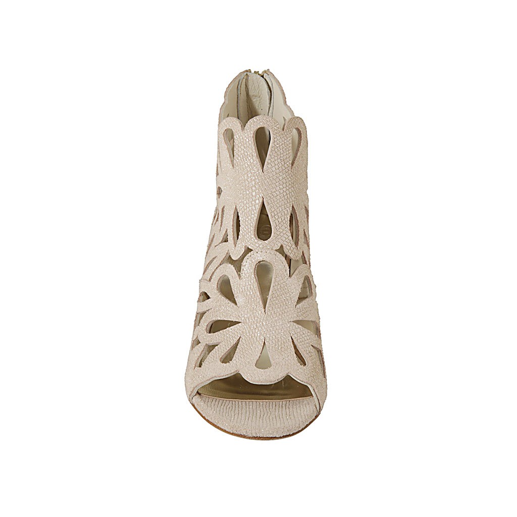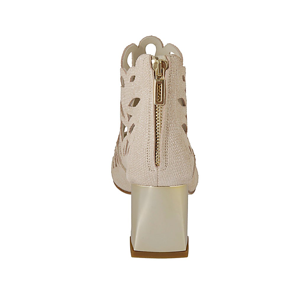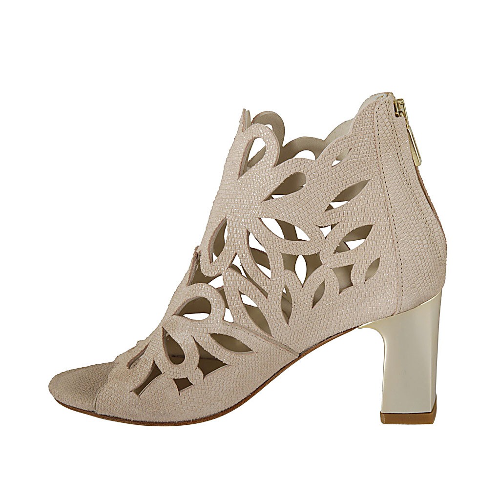 Offener Damenschuh mit Reissverschluss aus rosafarbenem glitzerndem bedrucktem perforiertem Wildleder Absatz 7