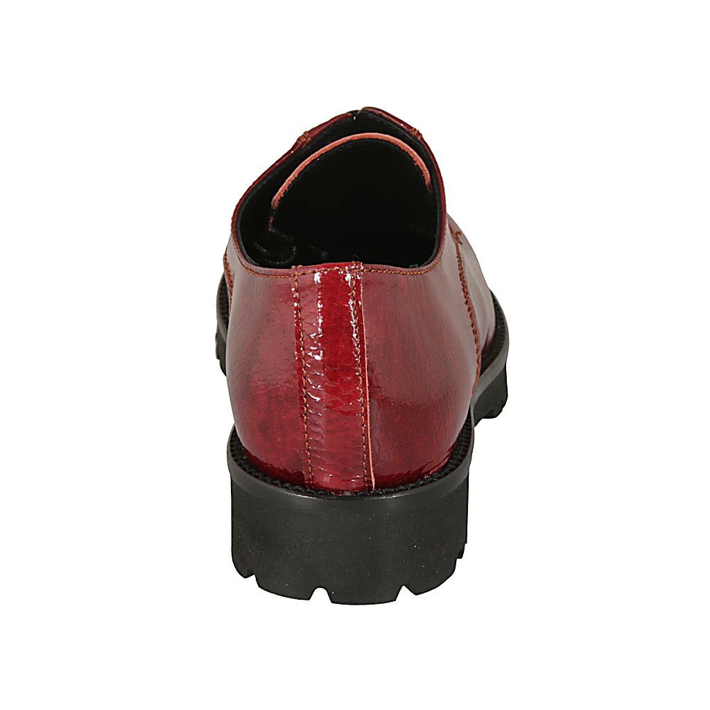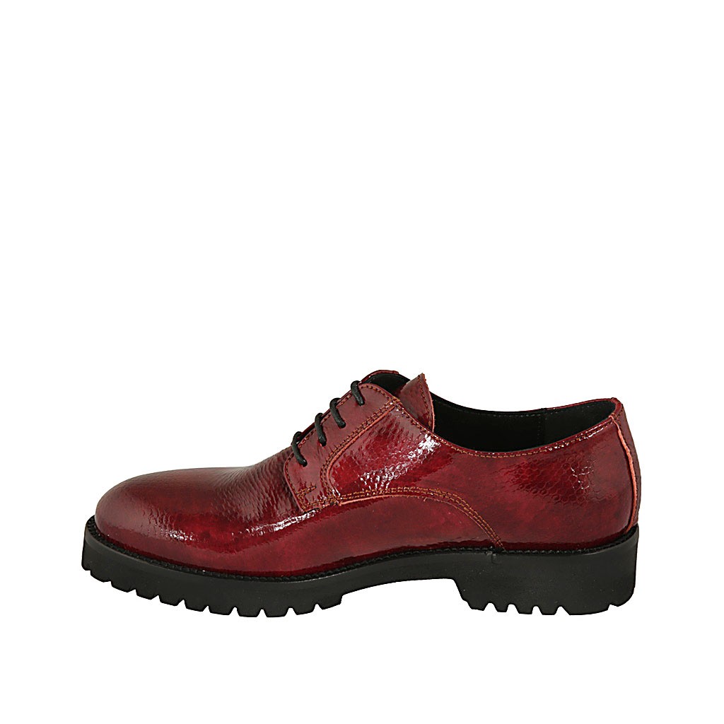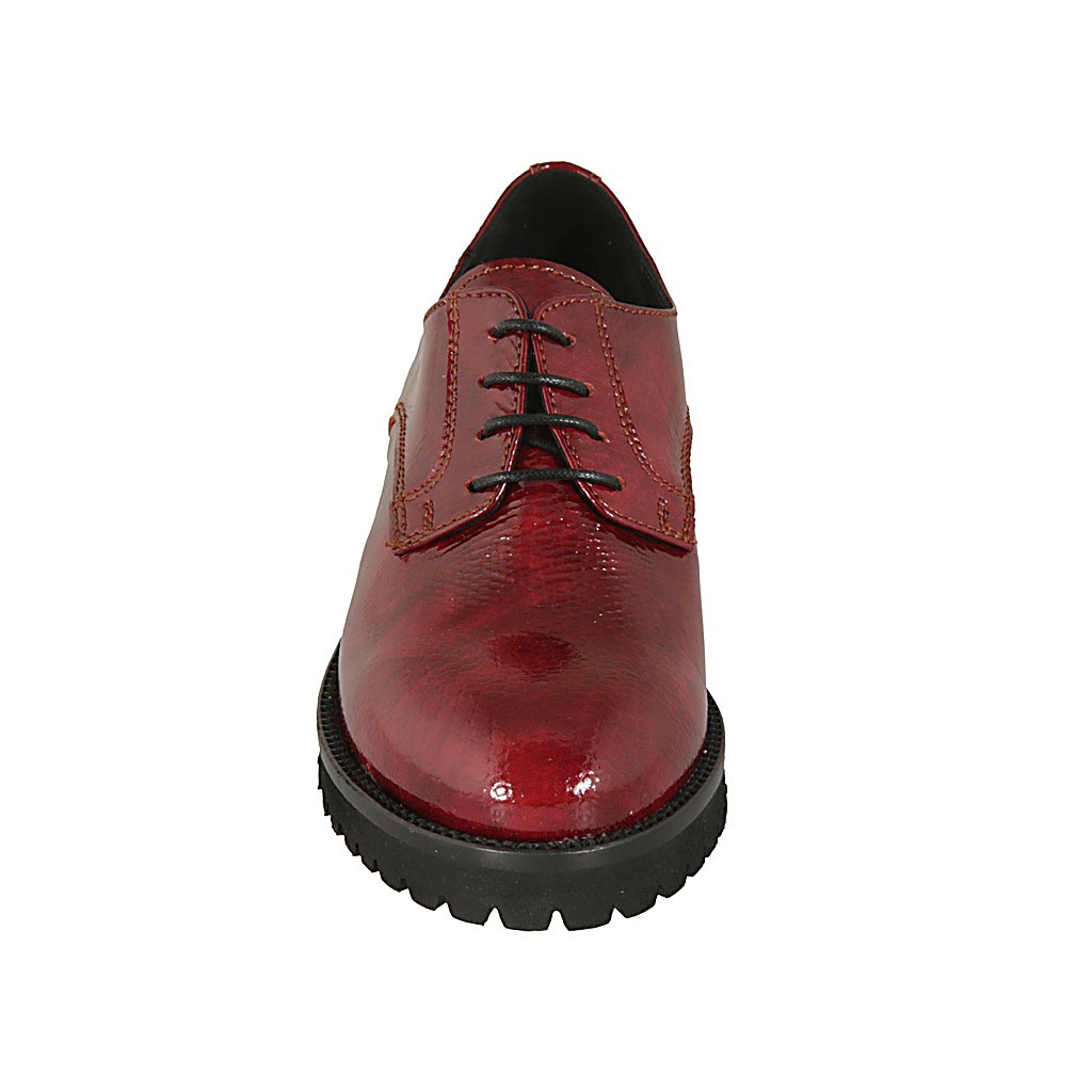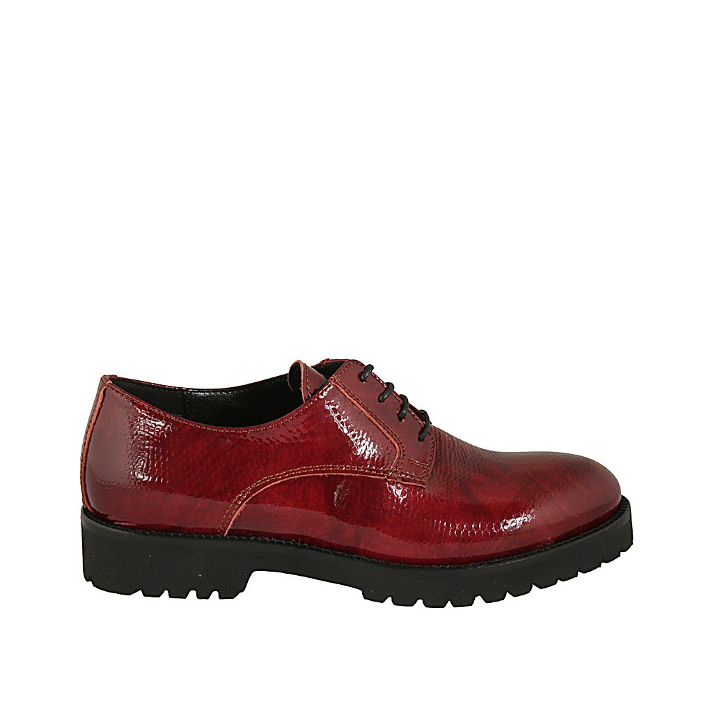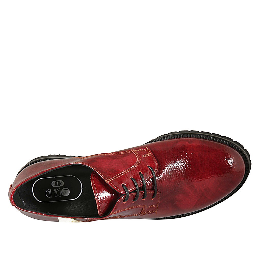 Die klassischen Schnürschuhe im britischen Stil aus funkelndem rotem Lackleder mit Schlangenmuster. Ein Schuh, der Ihren Look mit Originalität und Eleganz vervollständigt.