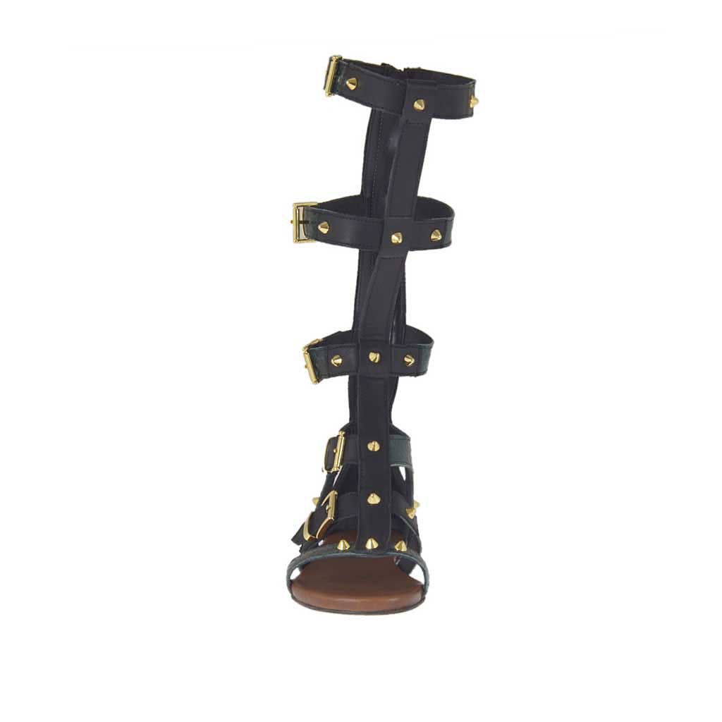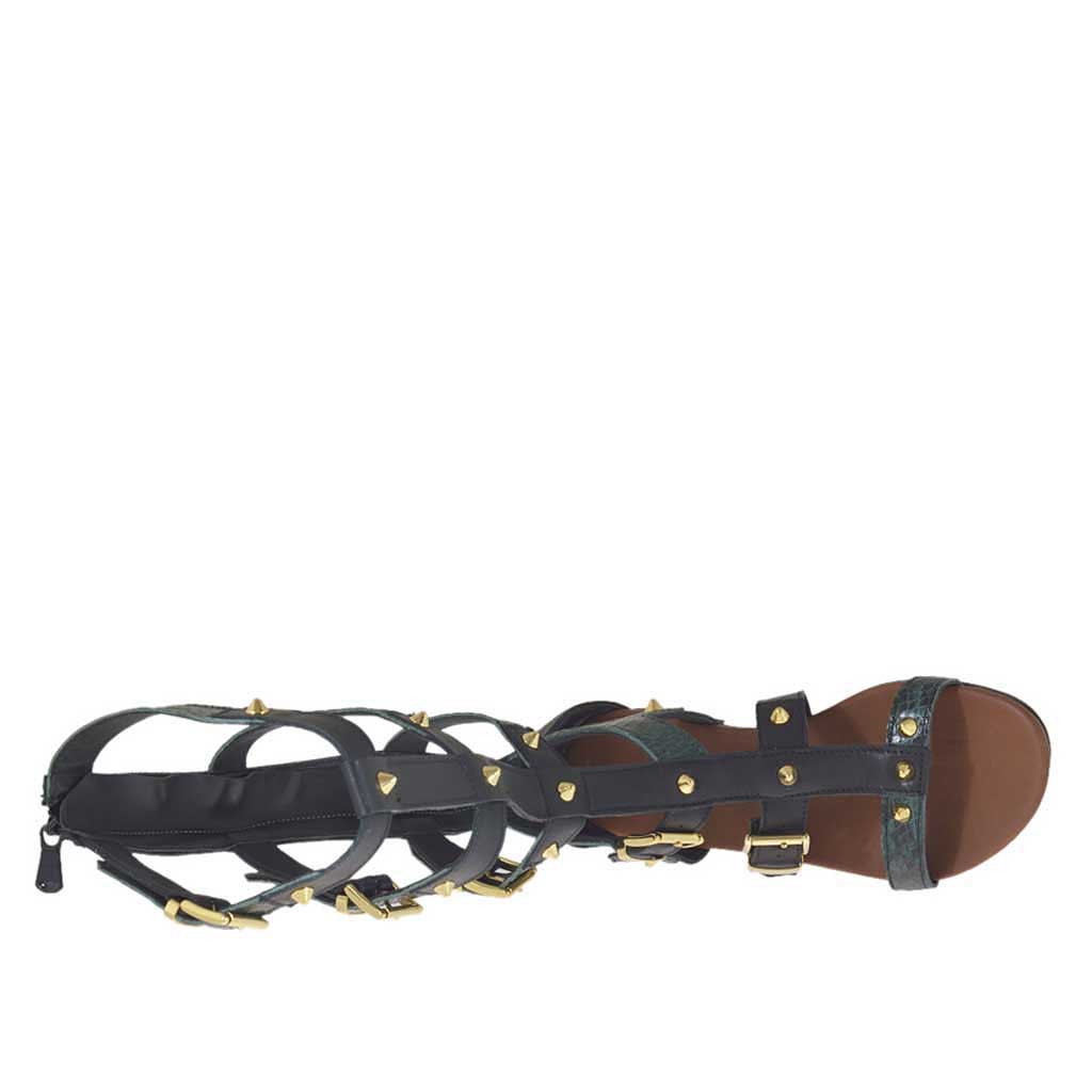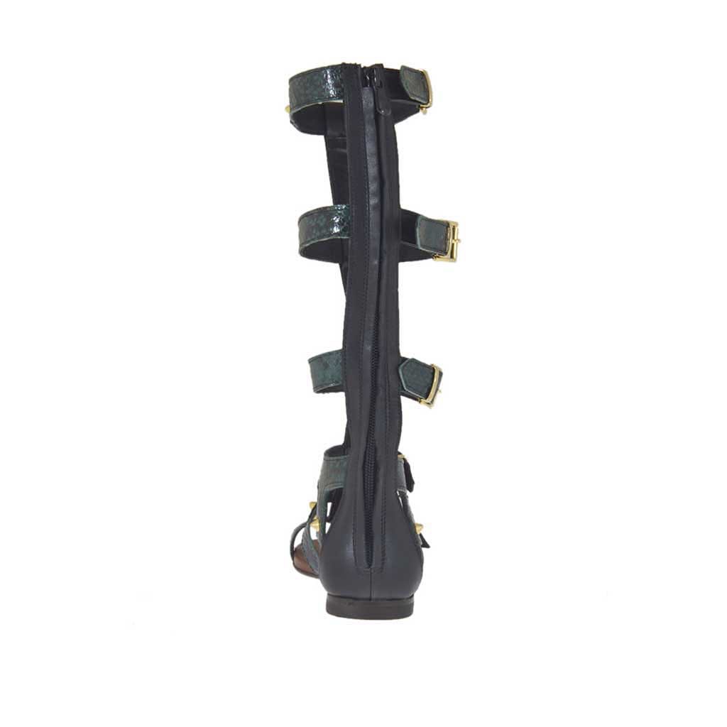 Offener Damenschuh im Gladiatorstil mit Reissverschluss, Nieten und Schnallen, 1 cm. hoher Absatz, aus schwarzem und grünbedrucktem Leder, Ledersohle, Lederfutter. Erhältlich in großen und kleinen Größen.