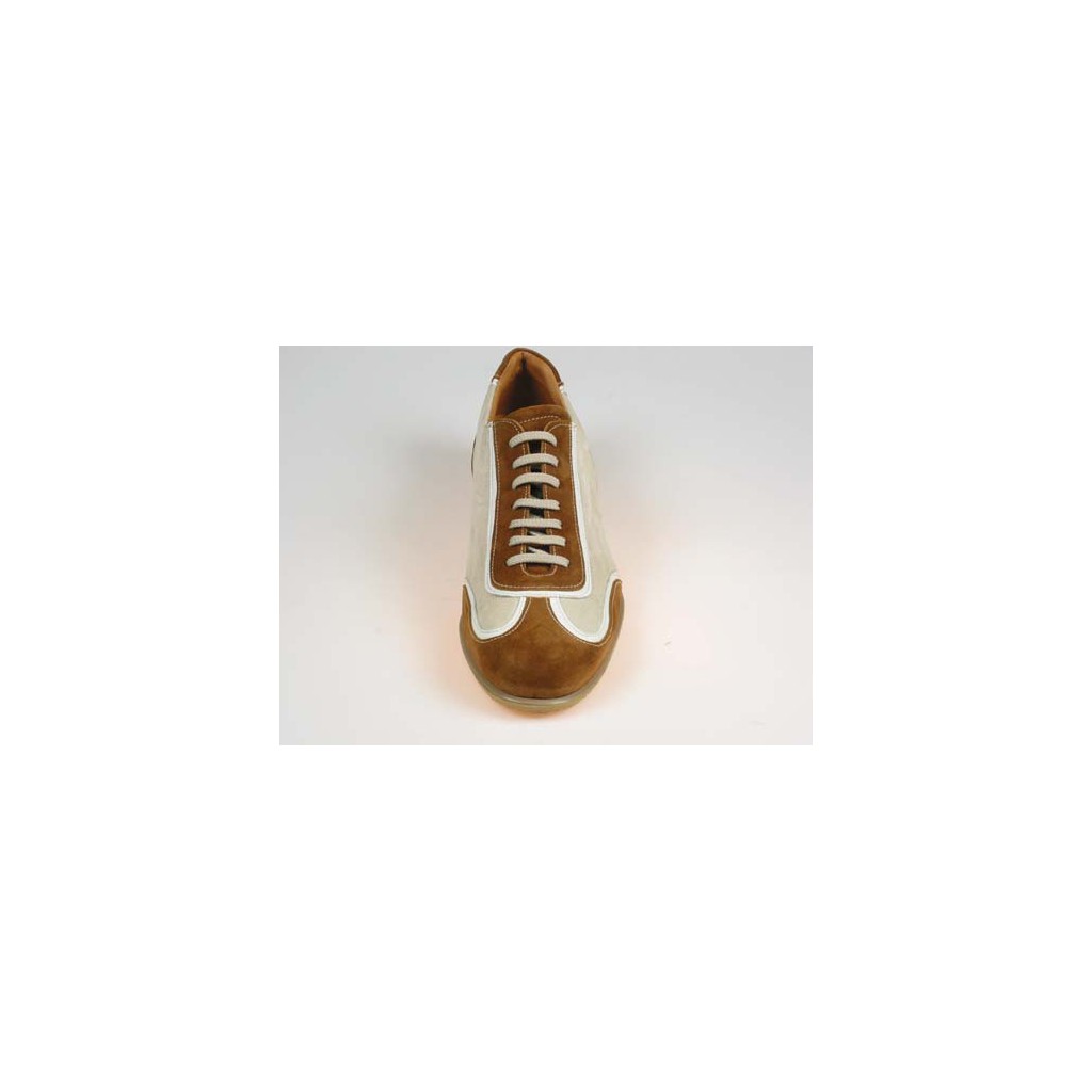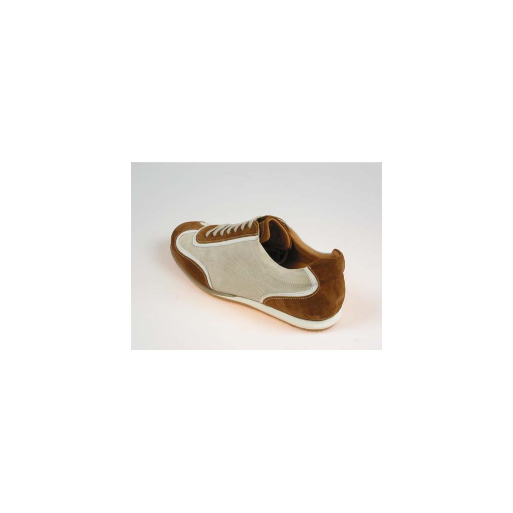 Sportlicher Herrenfreizeitschuh mit Schnürsenkel, aus tabakbraunem und beigem Wildleder, Gummisohle, Lederfutter.