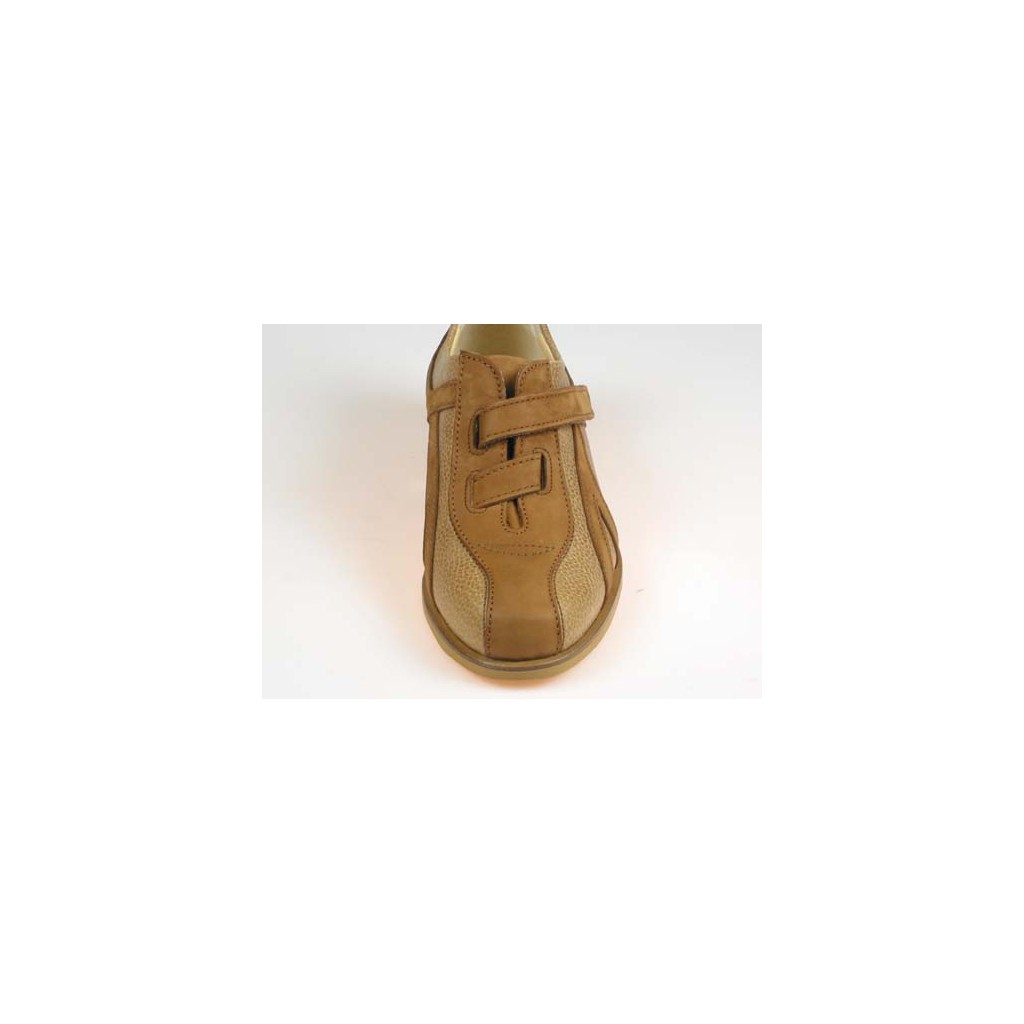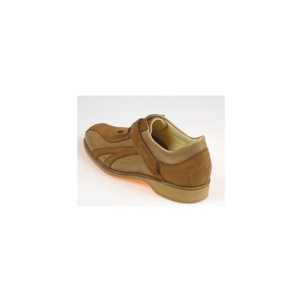 Herrenfreizeitschuh mit Klettverschluss, aus hellbraunem und braunem Leder, Gummisohle, Lederfutter.