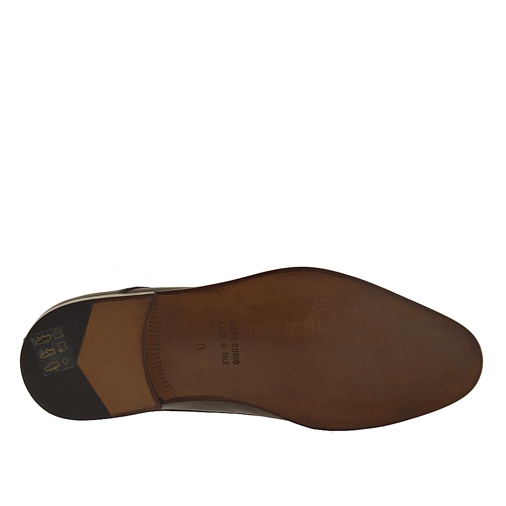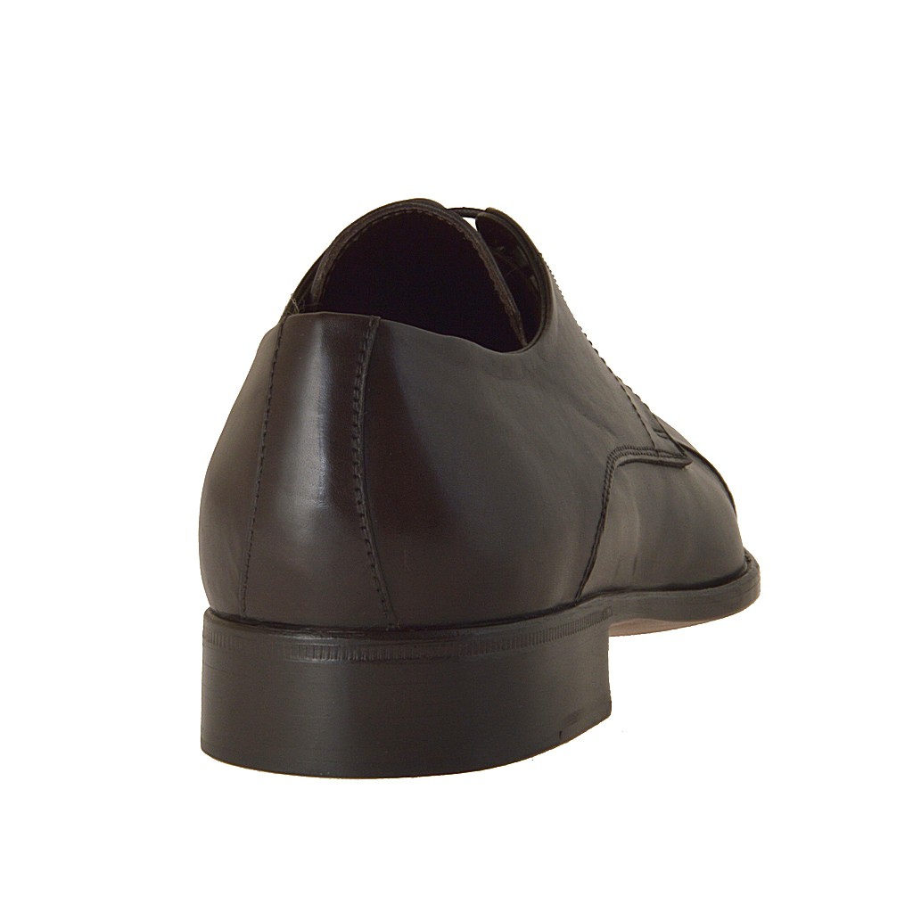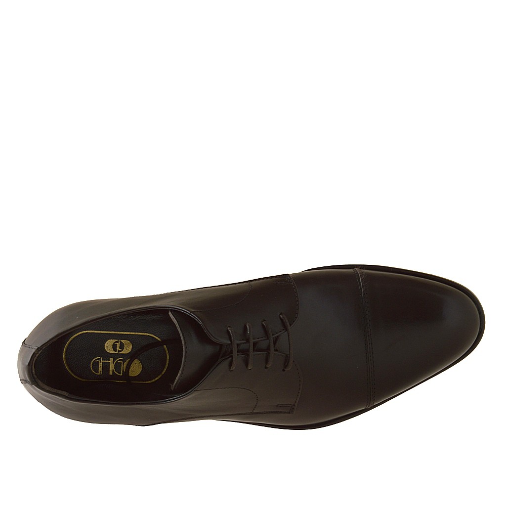 Eleganter Herrenderbyschuh mit Schnürsenkeln, aus dunkelbraunem Leder, Ledersohle, Lederfutter.