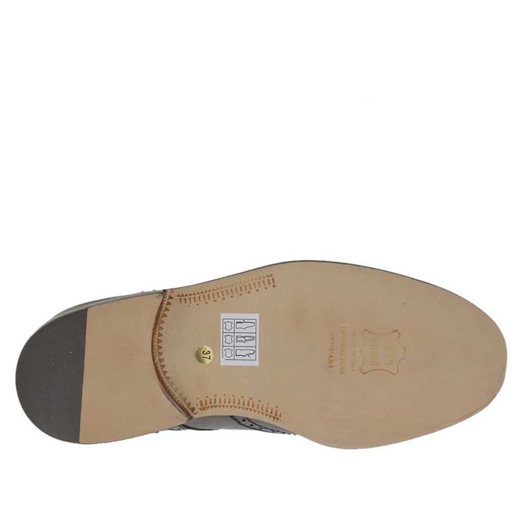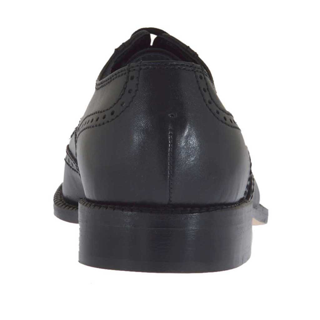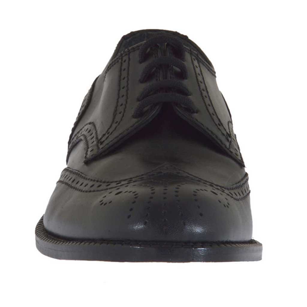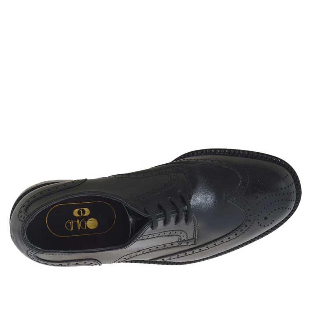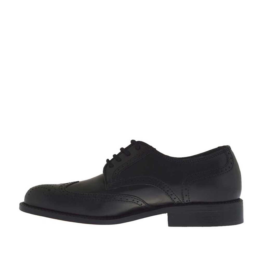 Herrenschuh mit Schnürsenkeln, aus schwarzfarbigem Leder, Ledersohle, Lederfutter. Erhältlich in grossen und kleinen Grössen.