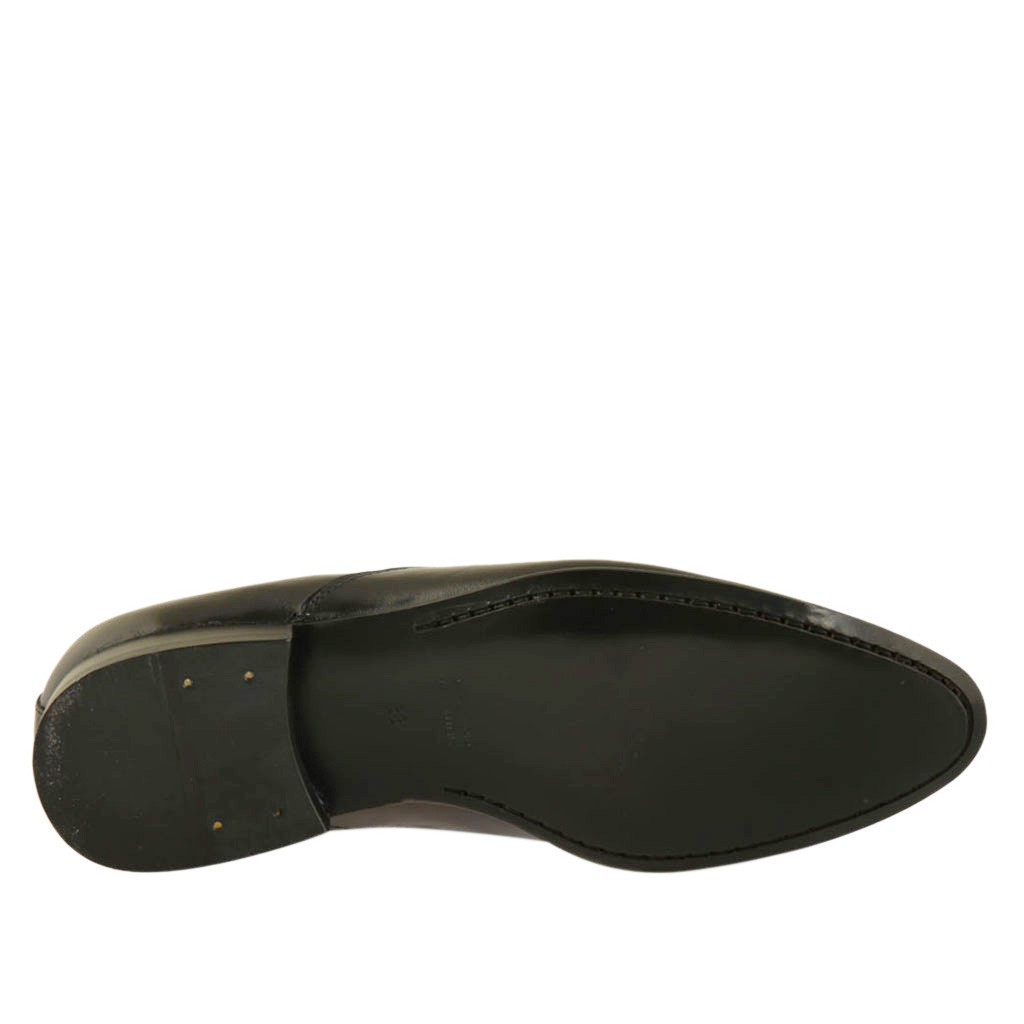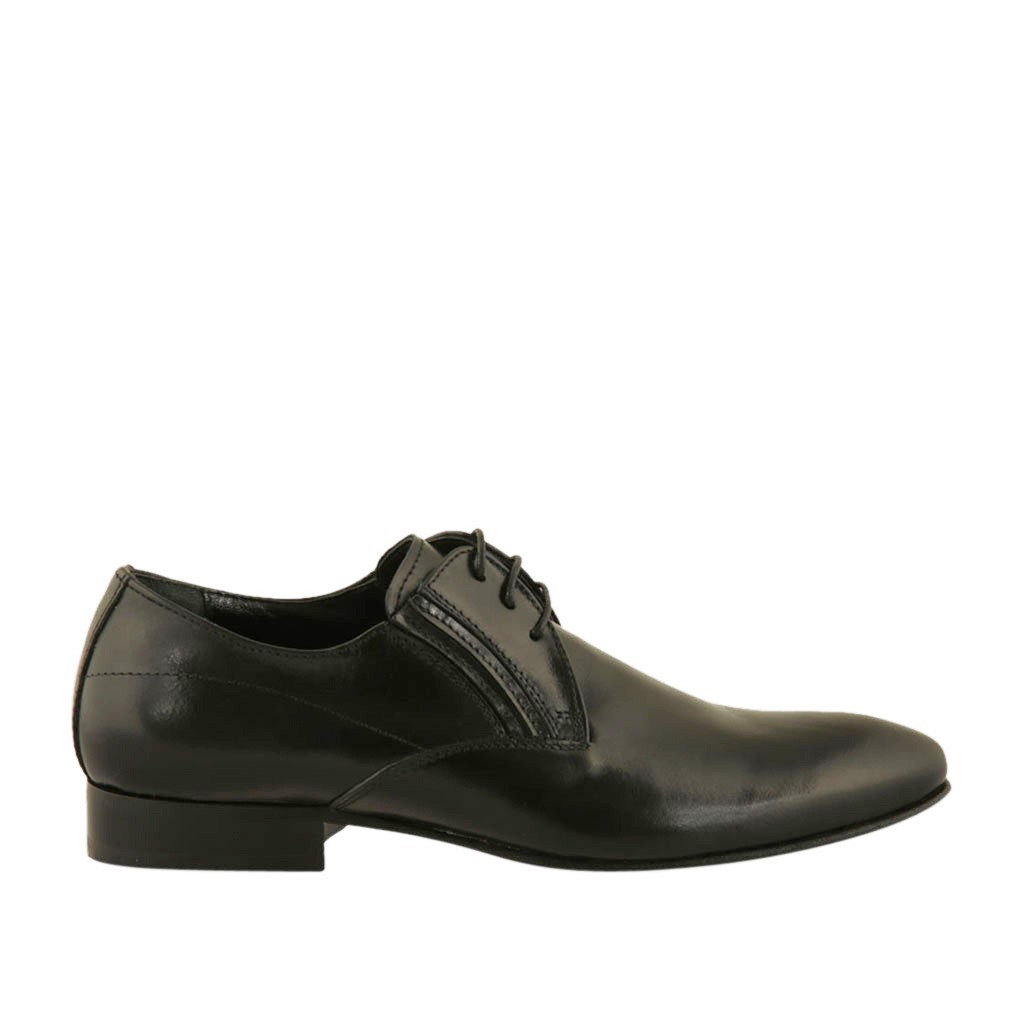 Eleganter Herrenschnürschuh im Derbystil mit Gummibändern und spitz-zulaufender Spitze aus glattem schwarzem Leder