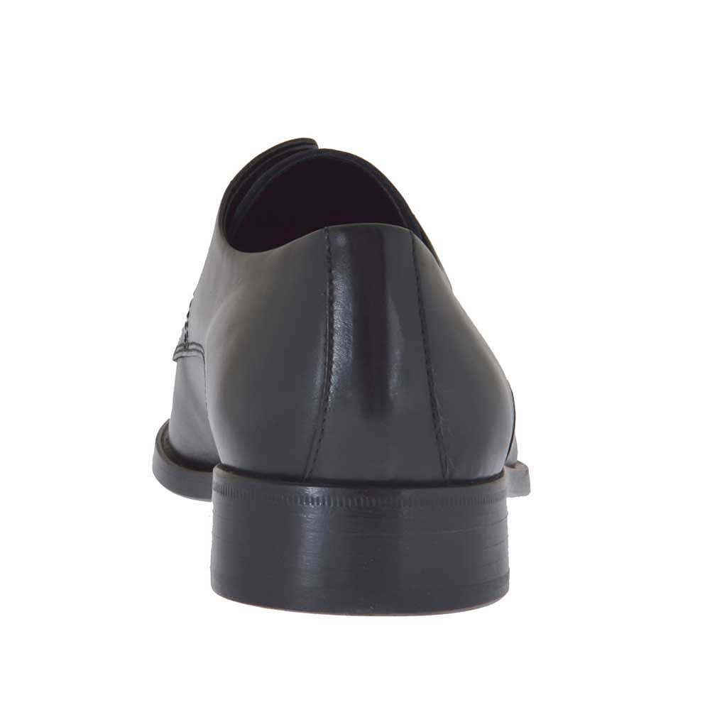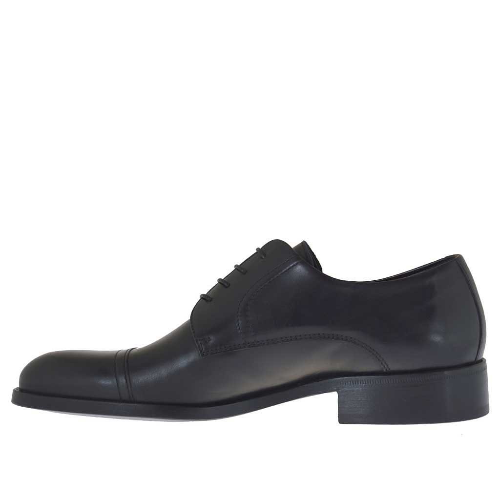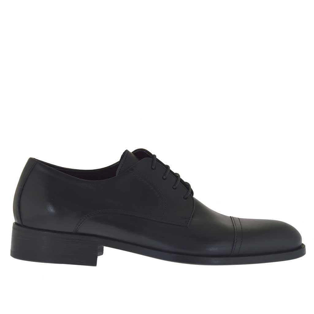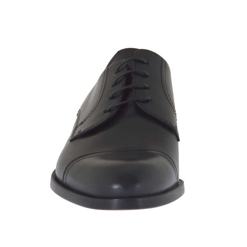 Herrenderbyschuh mit Schnürsenkeln, aus schwarzfarbigem Leder, Ledersohle, Lederfutter. Erhältlich in grossen und kleinen Grössen.