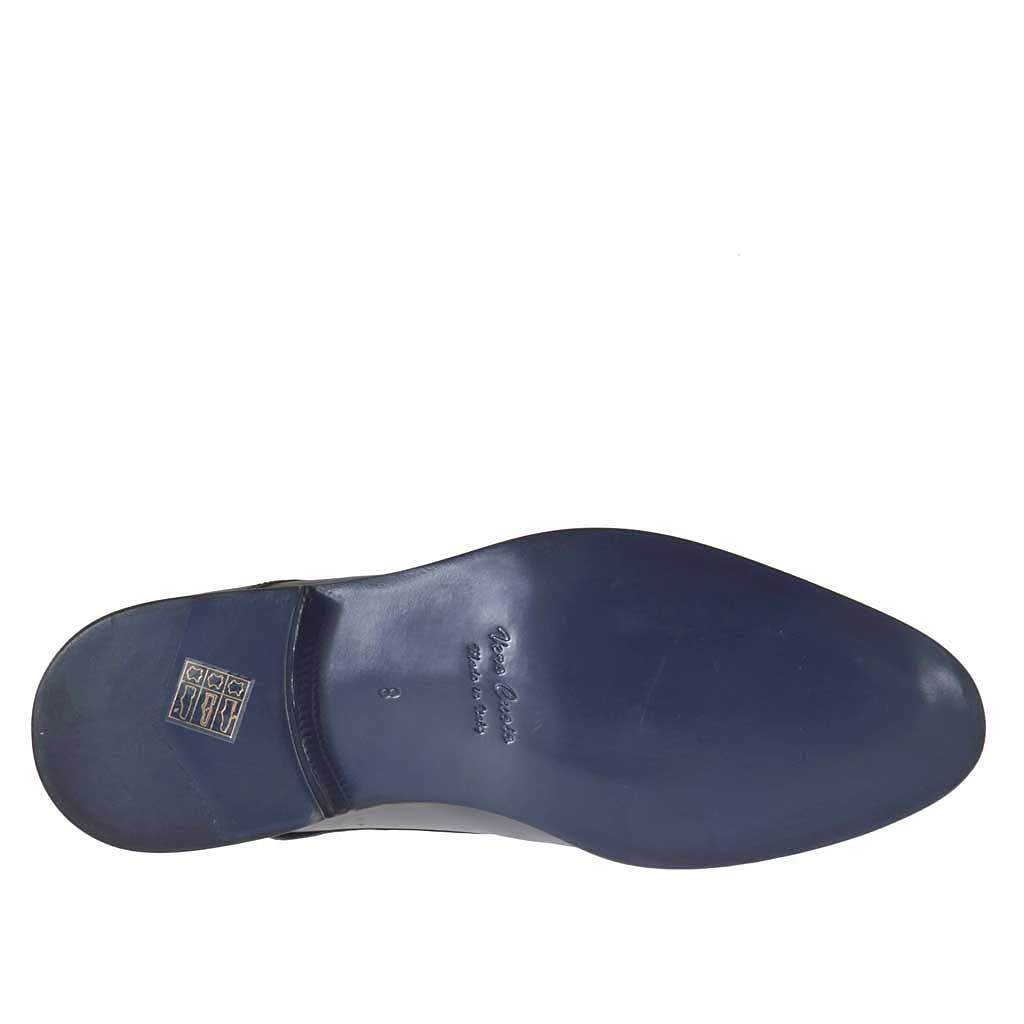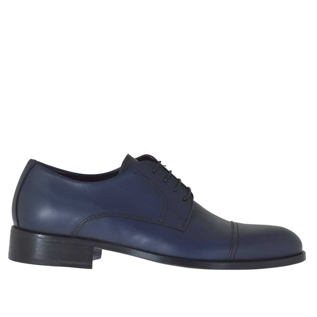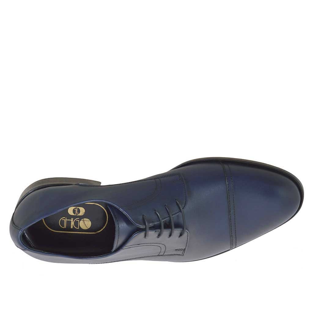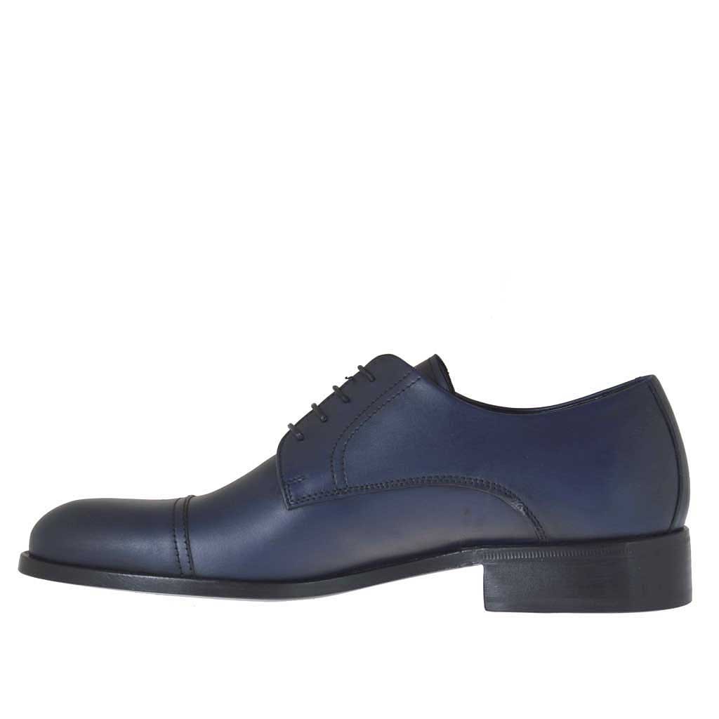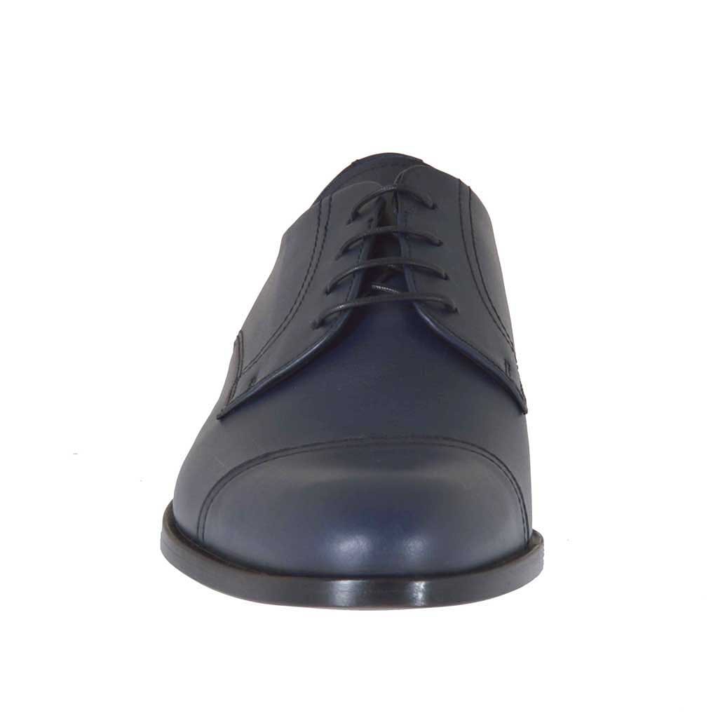 Eleganter Derbyschuh mit Schnürsenkeln für Herren, aus blauem Leder, Ledersohle, Lederfutter. Erhältlich in großen und kleinen Größen.
