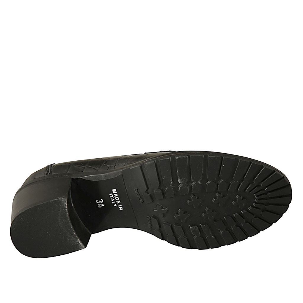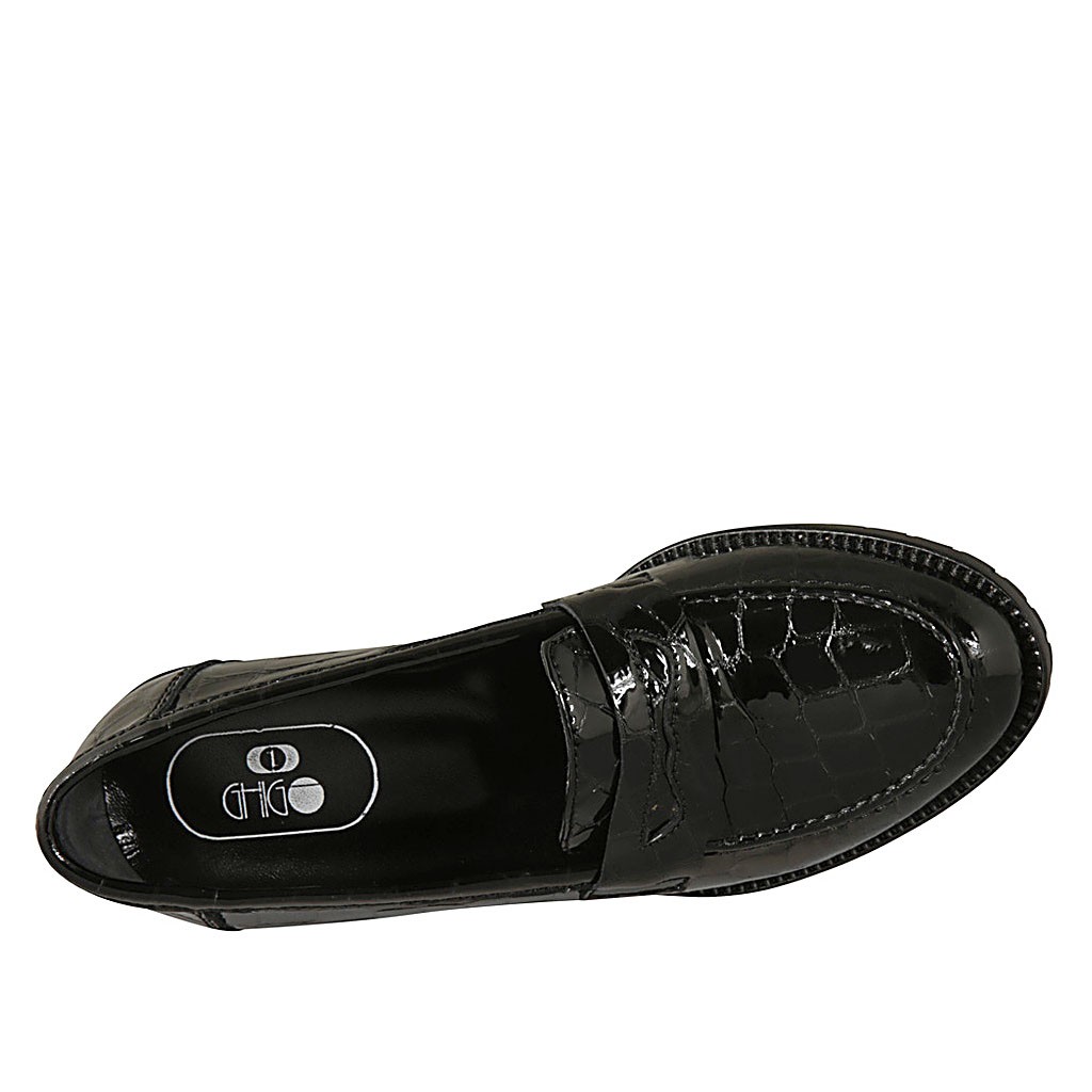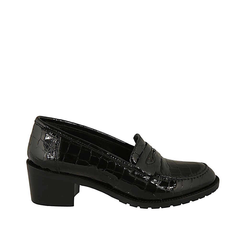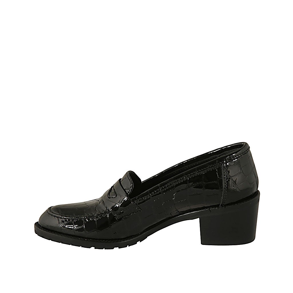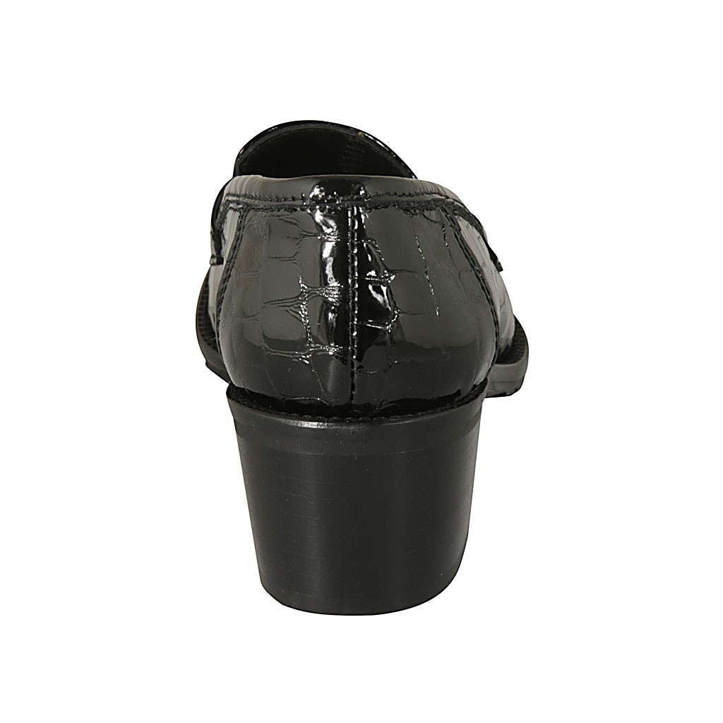 Damenmokassin aus schwarzem bedrucktem Lackleder Absatz 5
