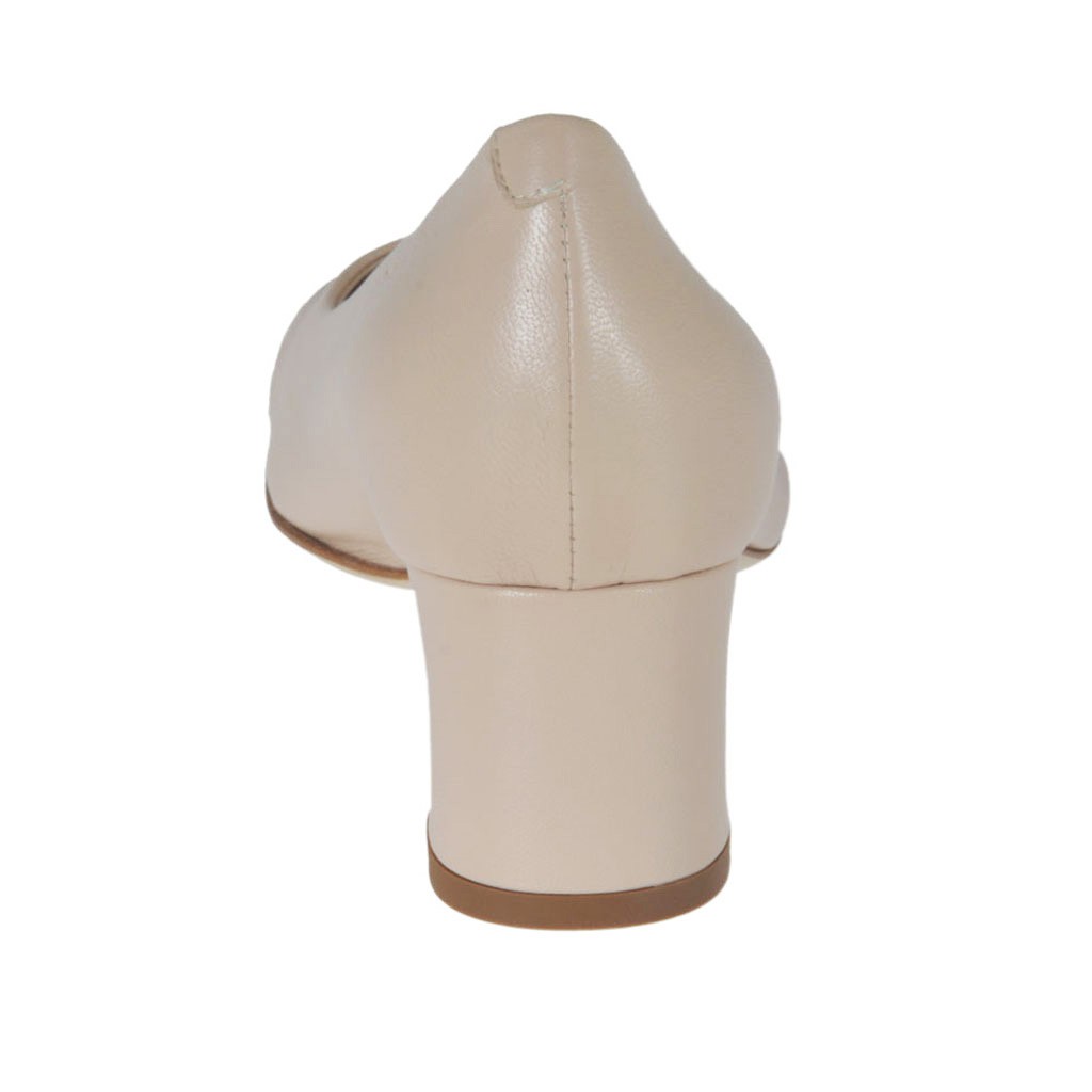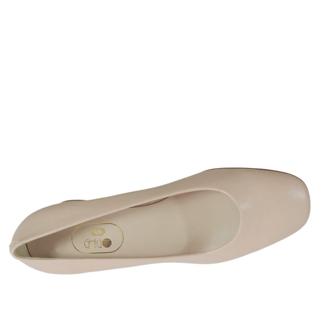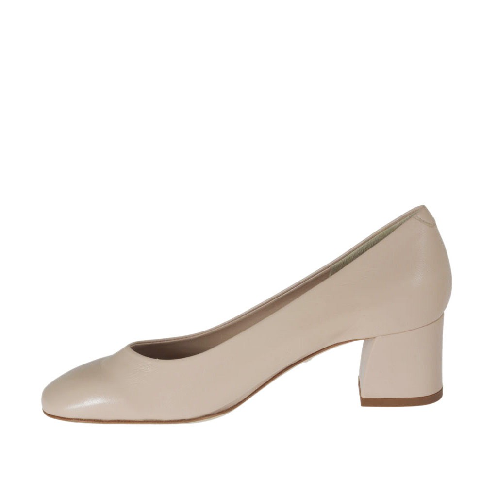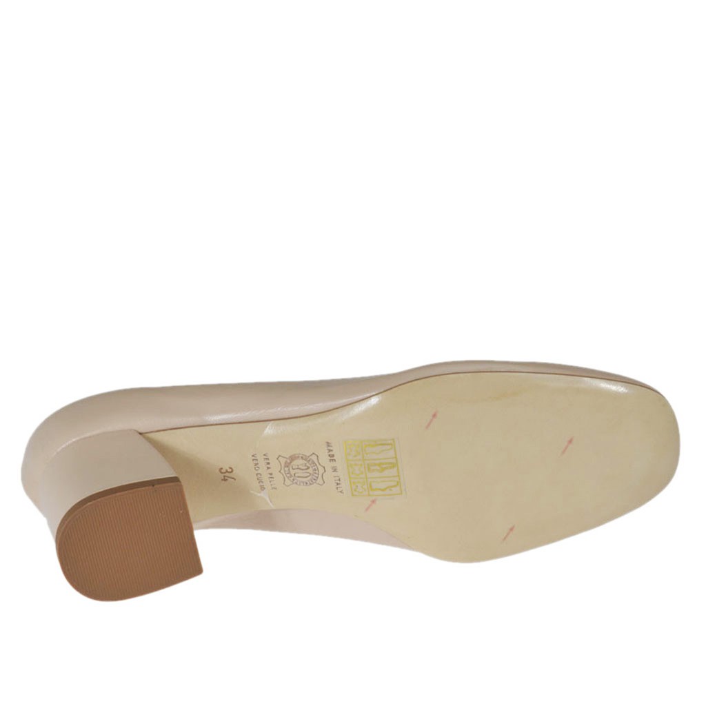 Damenpumpschuh mit quadrater Spitze, 5 cm. hoher Absatz, aus puderrosafarbenem Leder, Ledersohle, ohne Futter. Erhältlich in kleinen und großen Größen.