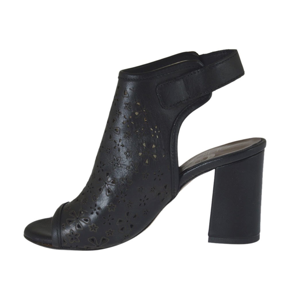 Hochgeschlossene Damensandale, 7 cm. hoher Absatz, aus schwarzem perforiertem Leder, Ledersohle, Lederfutter. Erhältlich in kleinen und großen Größen.