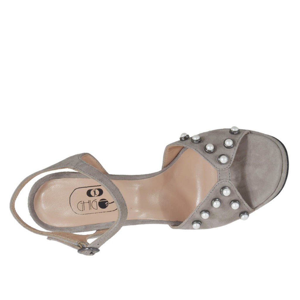 Damenriemsandale mit Plateau und Perlen, 10cm. hoher Absatz und 1cm hohes Plateau, aus grauem Wildleder, Ledersohle, Lederfutter. Erhältlich in kleinen und großen Größen.