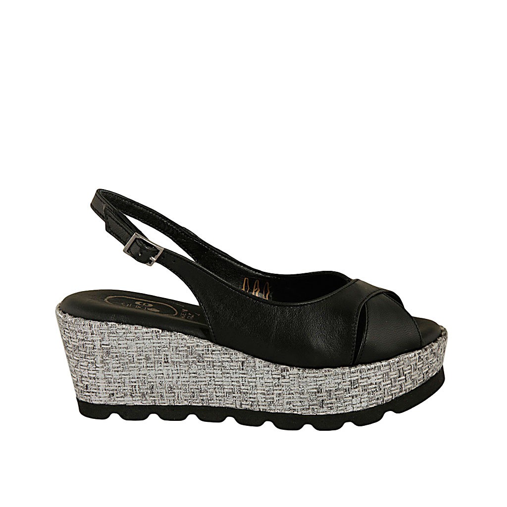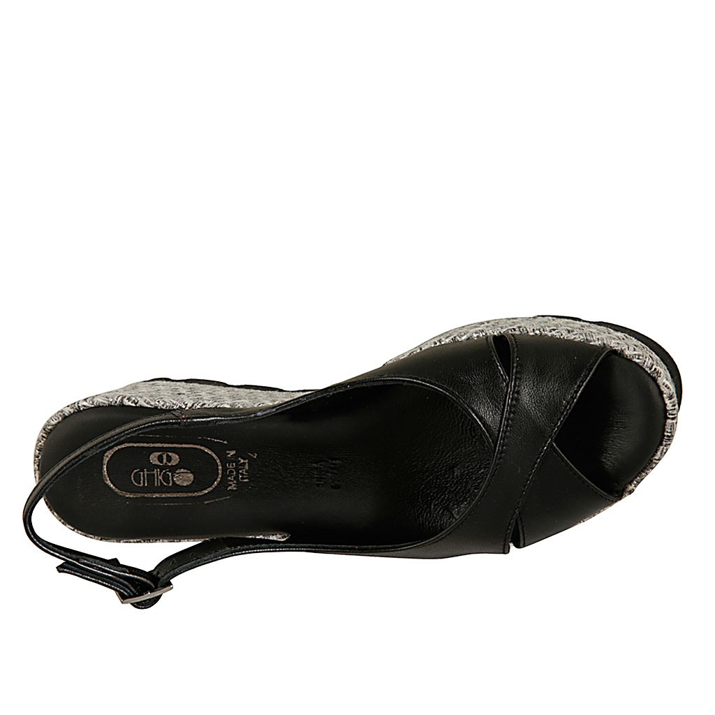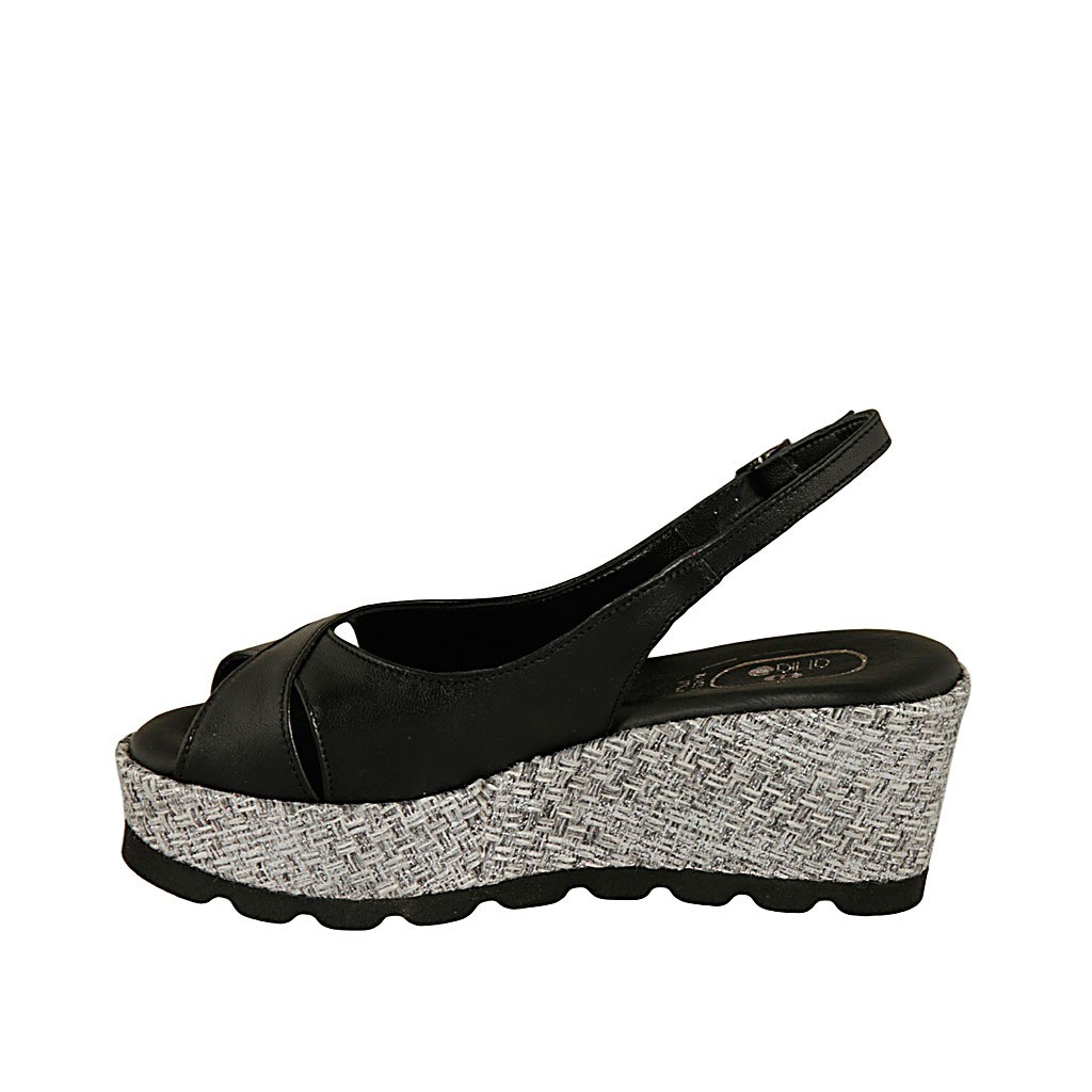 Damensandale aus schwarzem Leder und grauem Stoff Keilabsatz 6