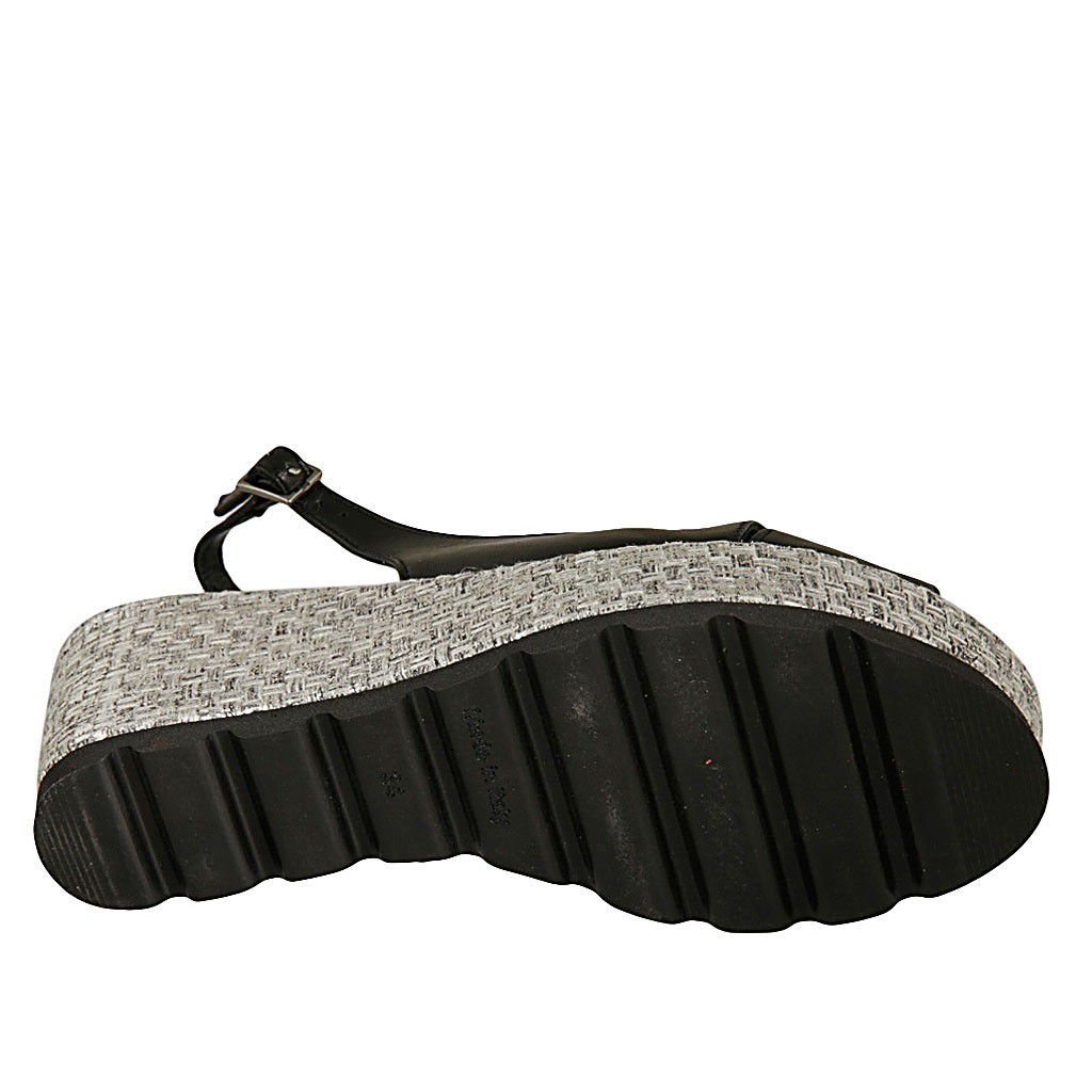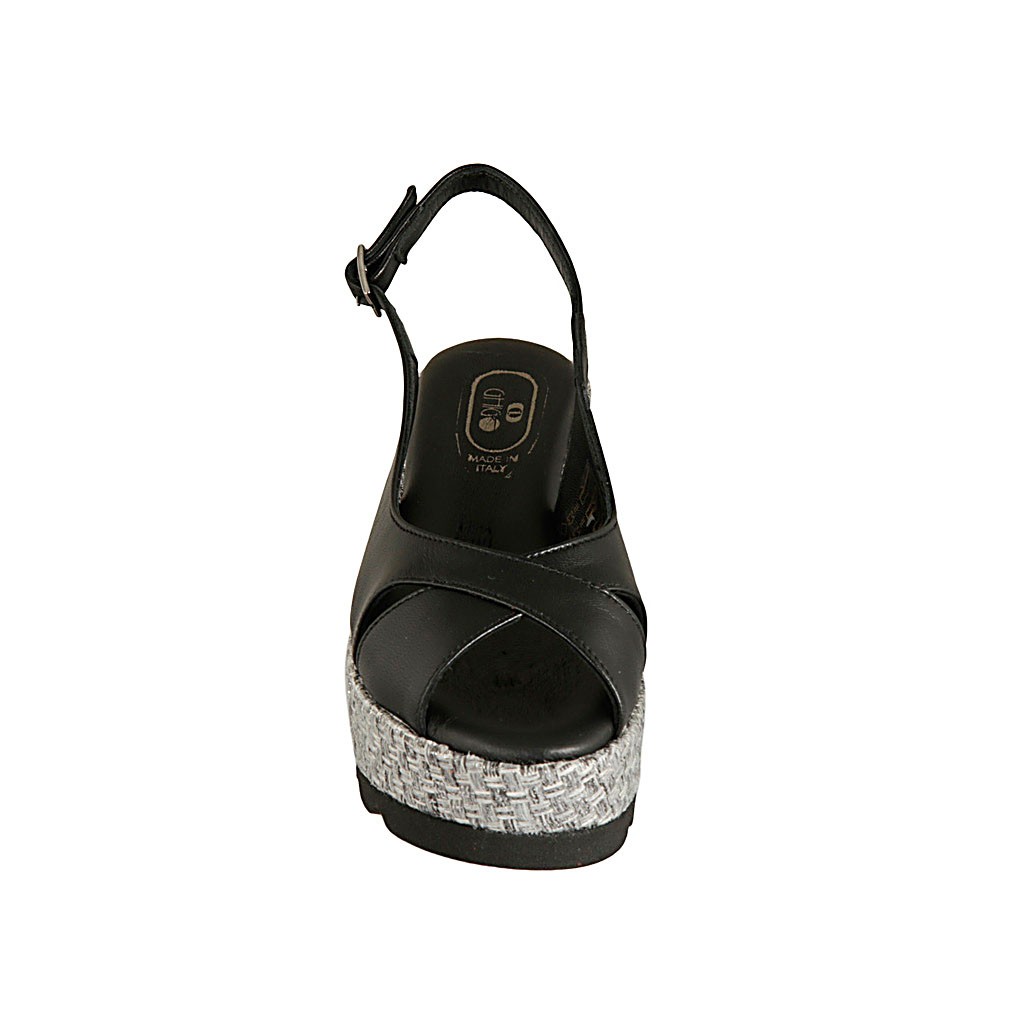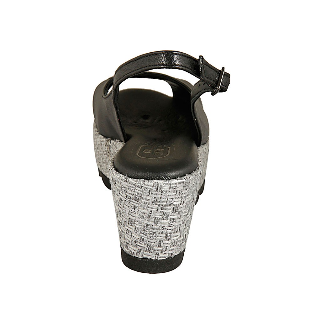 Damensandale aus schwarzem Leder und grauem Stoff Keilabsatz 6