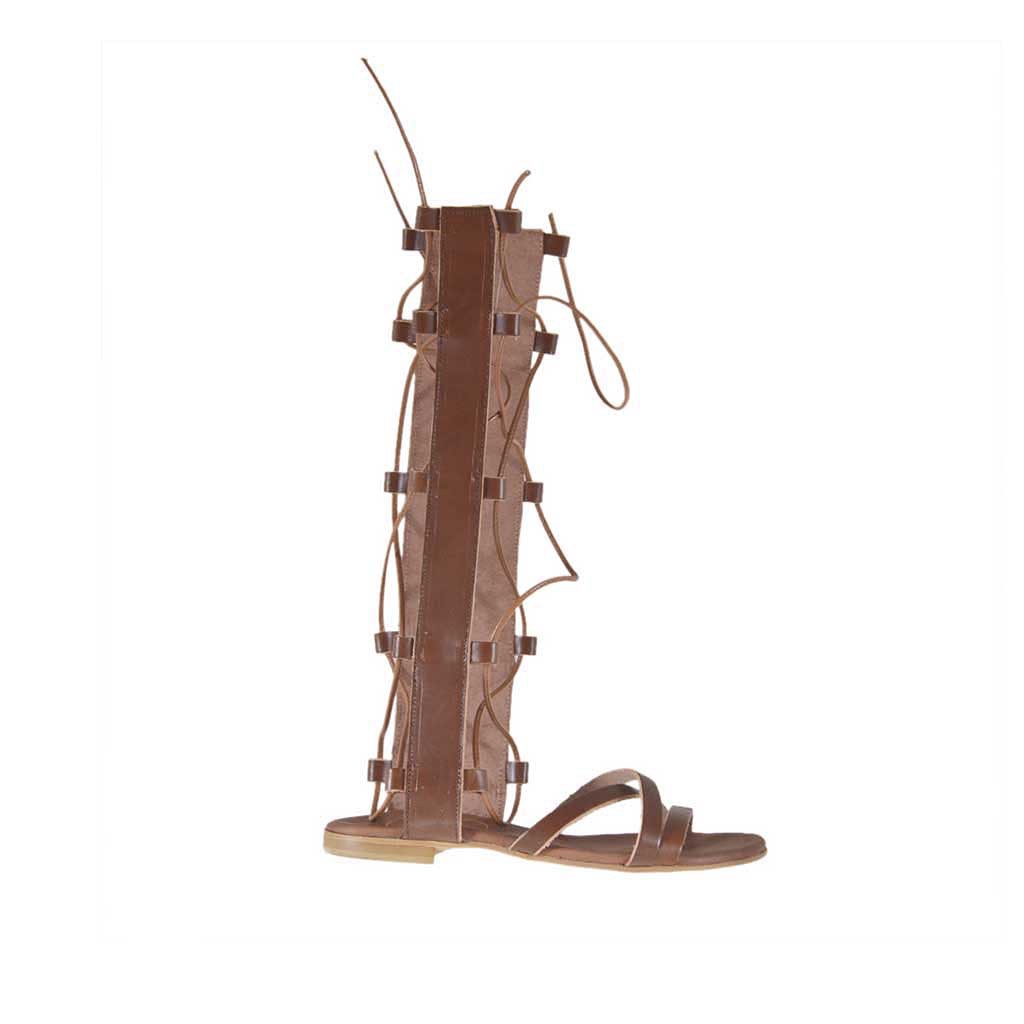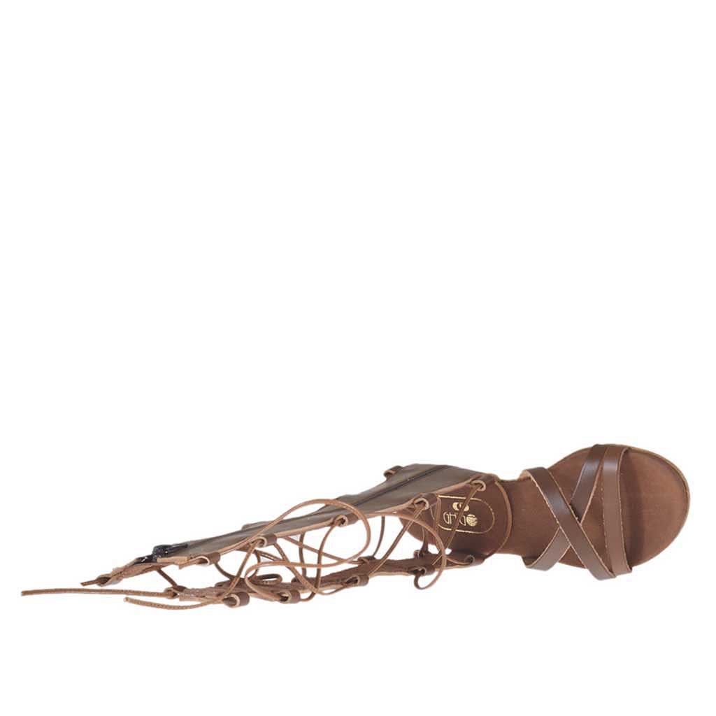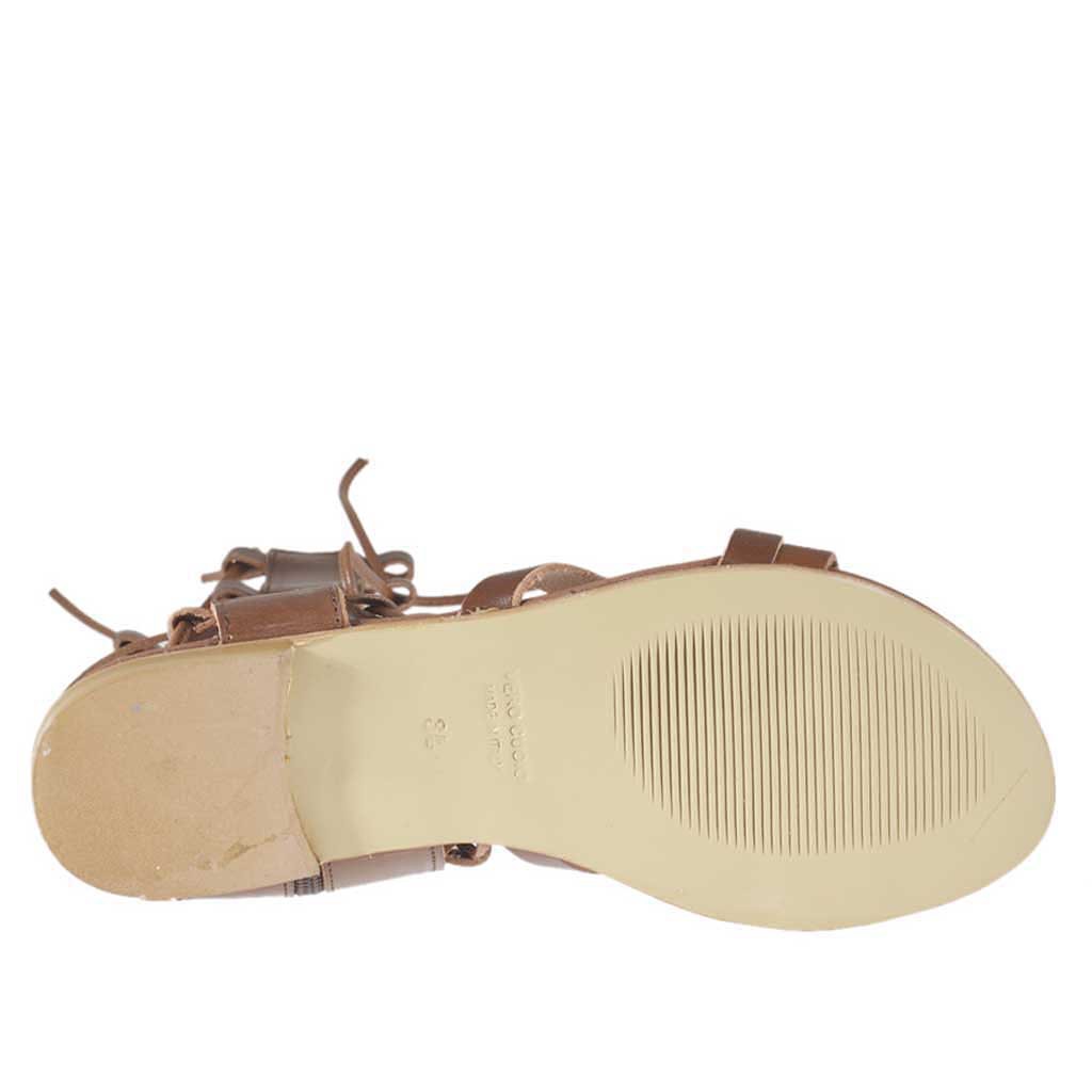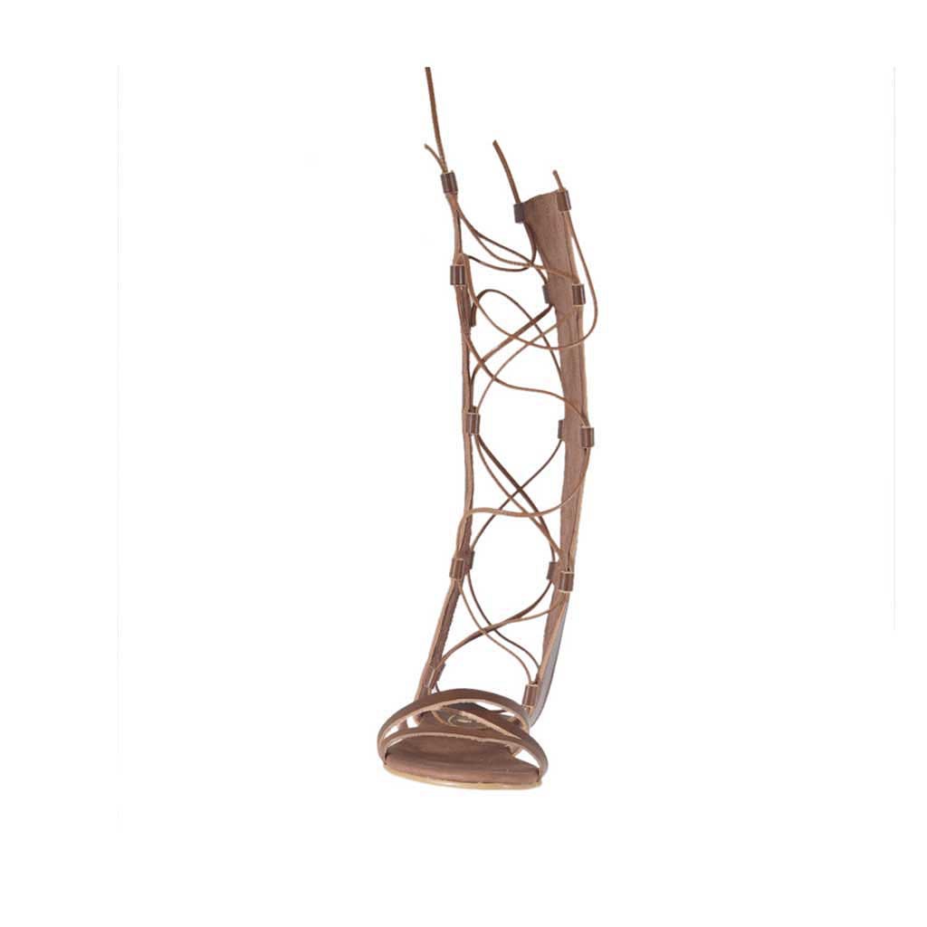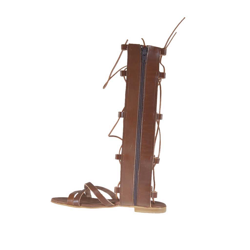 Damensandale im Gladiatorstil mit Reissverschluss und Schnüren, 1 cm. hoher Absatz, aus hellbraunem Leder, Ledersohle, Lederfutter. Erhältlich in großen und kleinen Größen.