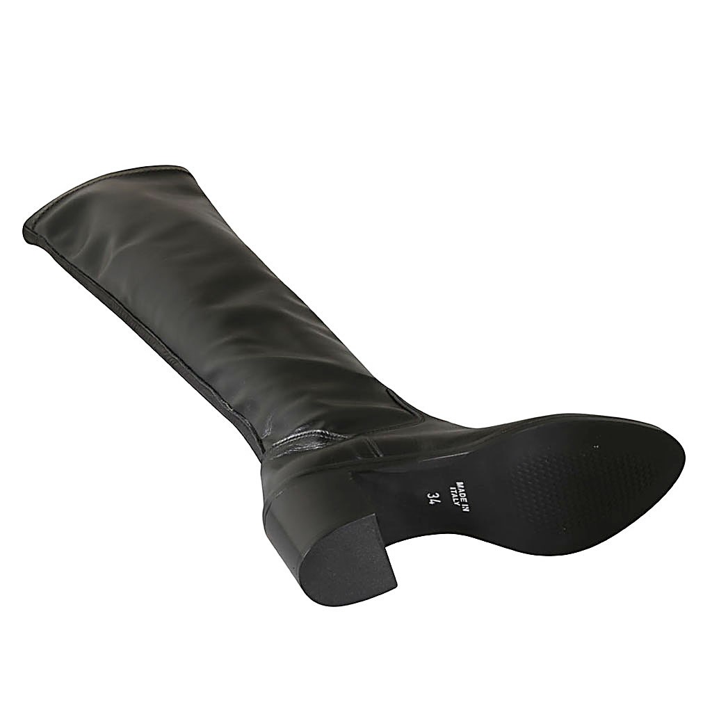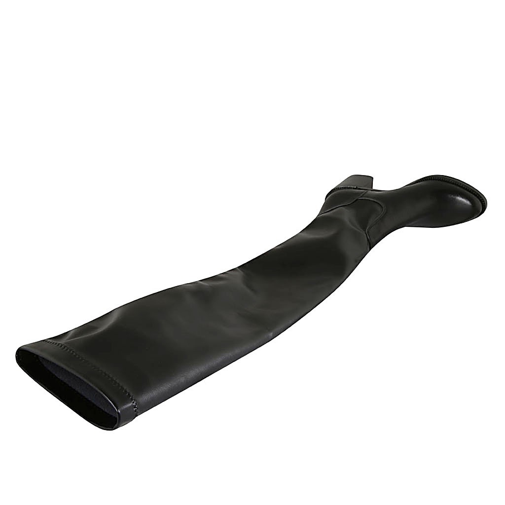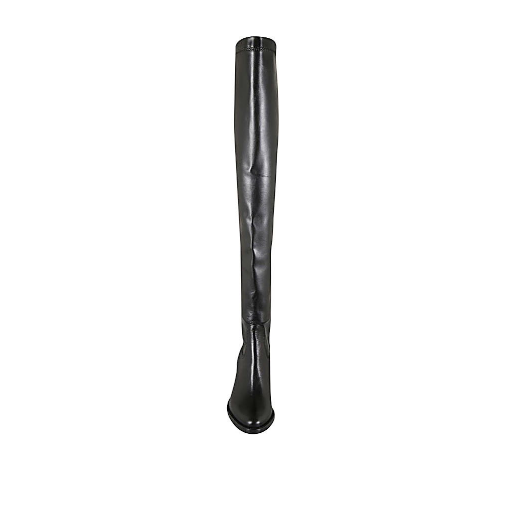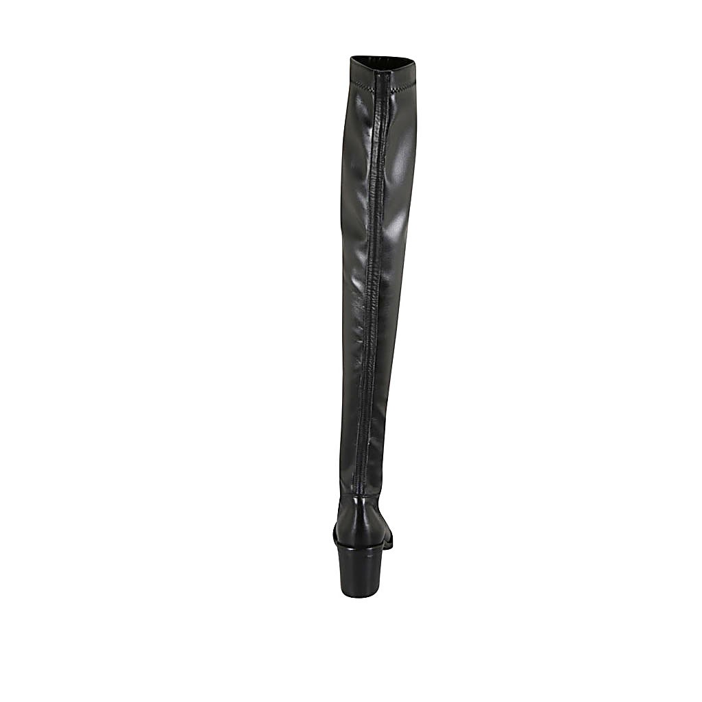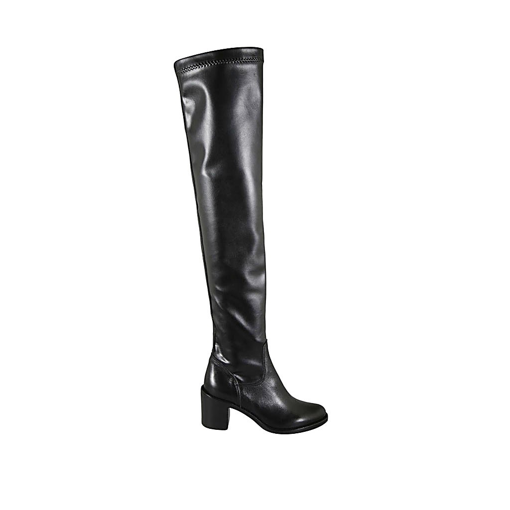 Schenkelhoher Damenstiefel aus schwarzem Leder und elastischem Material Absatz 6