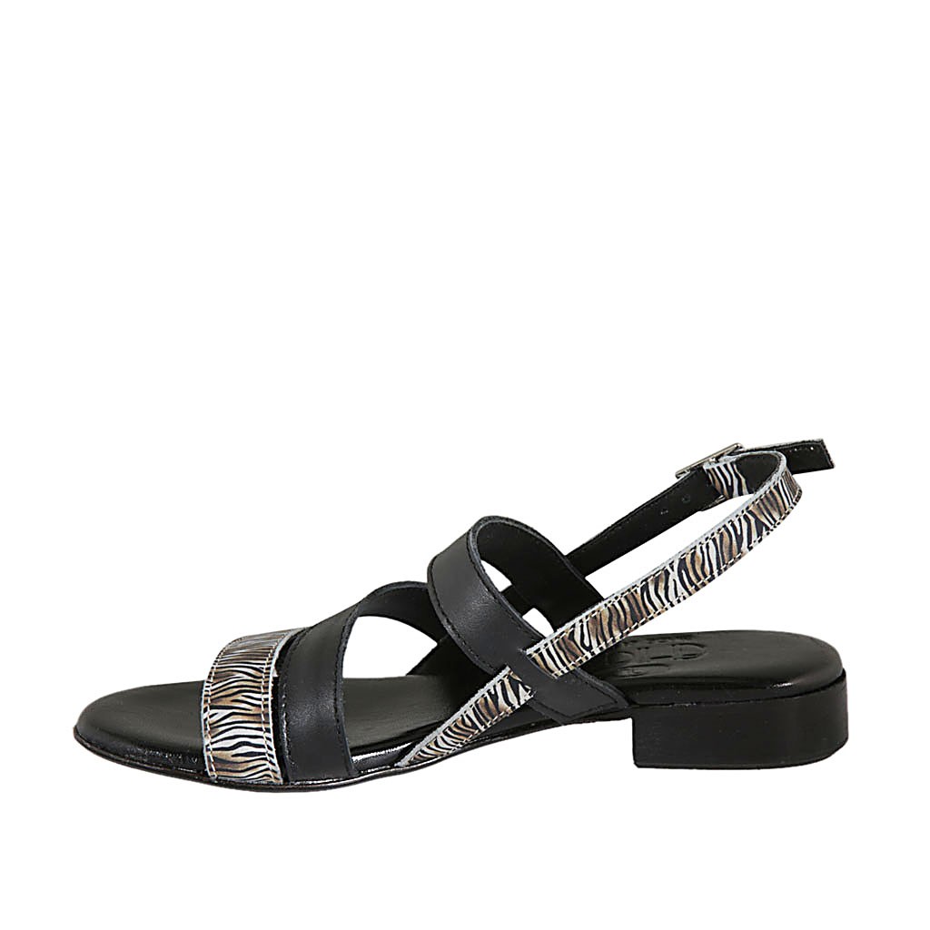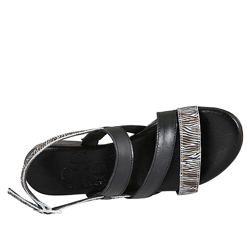 Woman's sandal in black leather and striped printed suede heel 2
