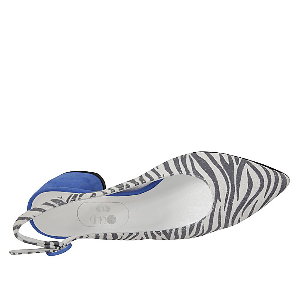 Woman's slingback pump in cornflower blue and black and white striped glittered suede heel 5