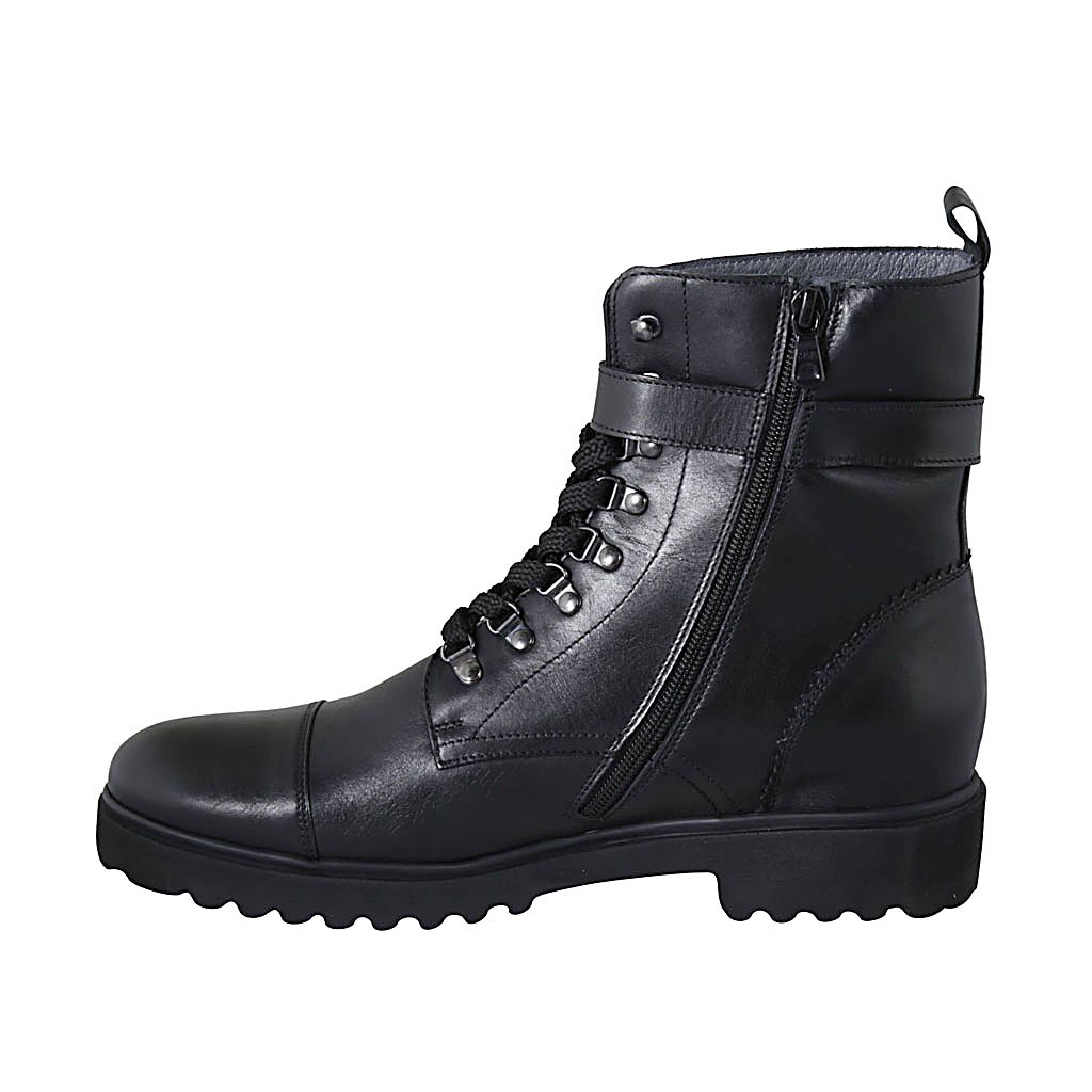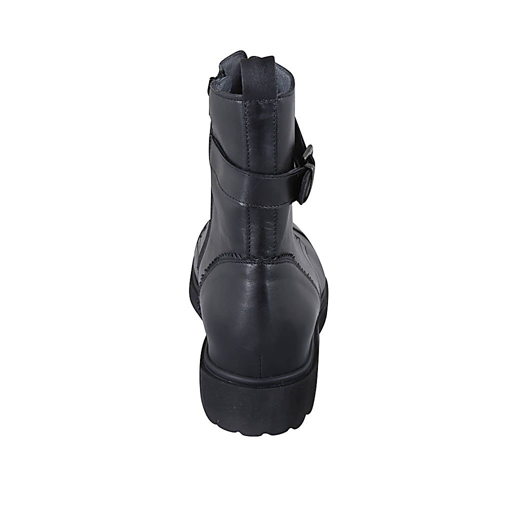 Woman's laced ankle boot with zipper, captoe and buckle in black leather heel 3
