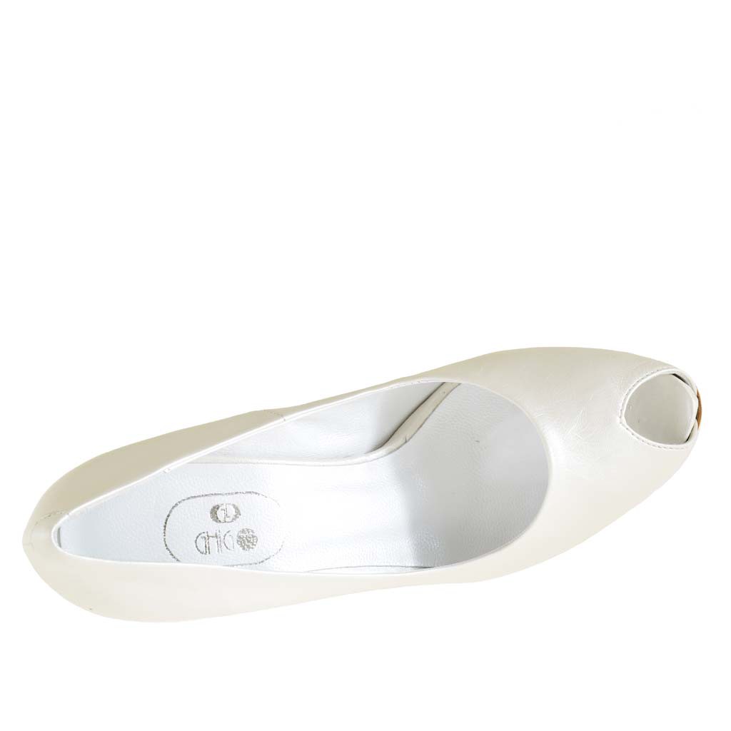 Woman open toe pumps with hidden platform, 10 cm. high heel and 2 cm. high platform, in pearled ivory leather, leather sole, leather lining. Available in small and big sizes.