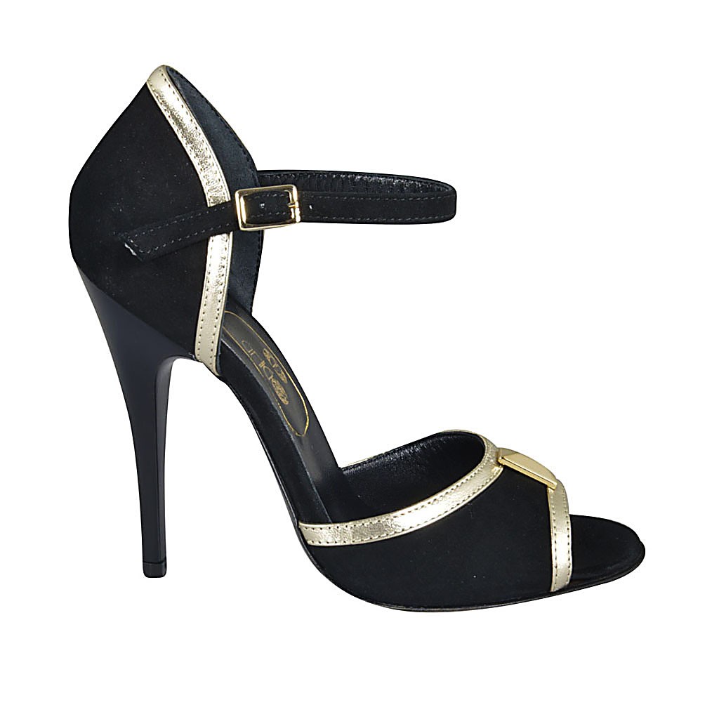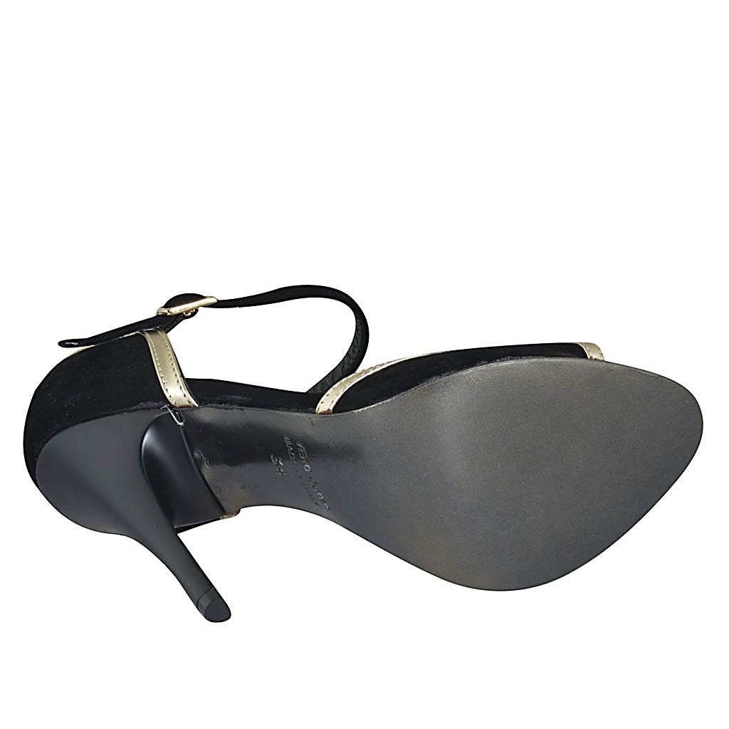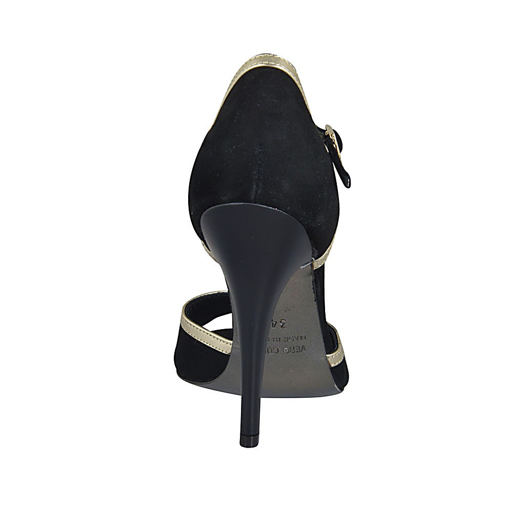 Woman's open shoe with accessory in black suede and platinum leather heel 11