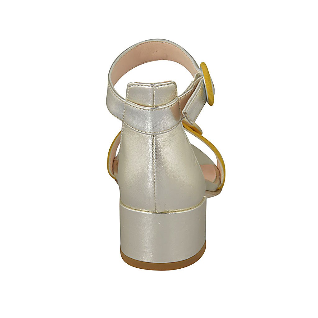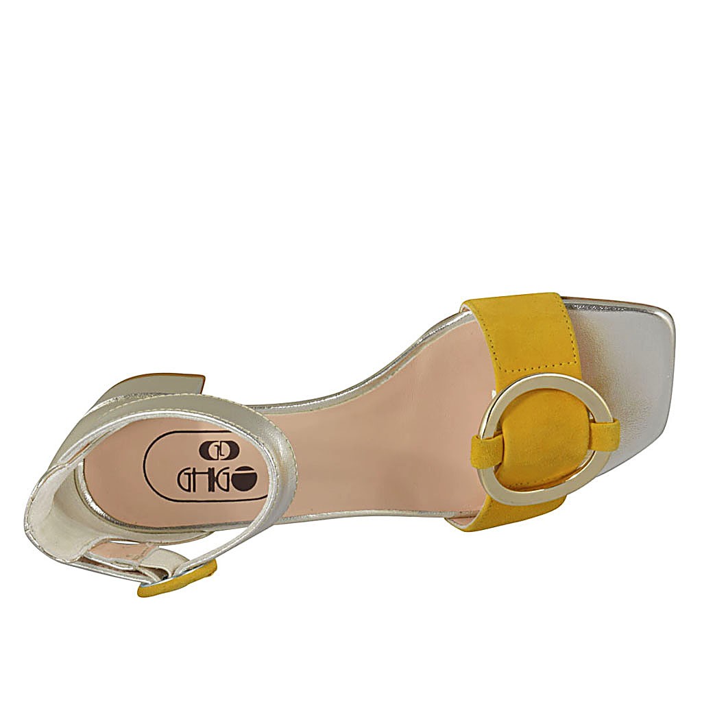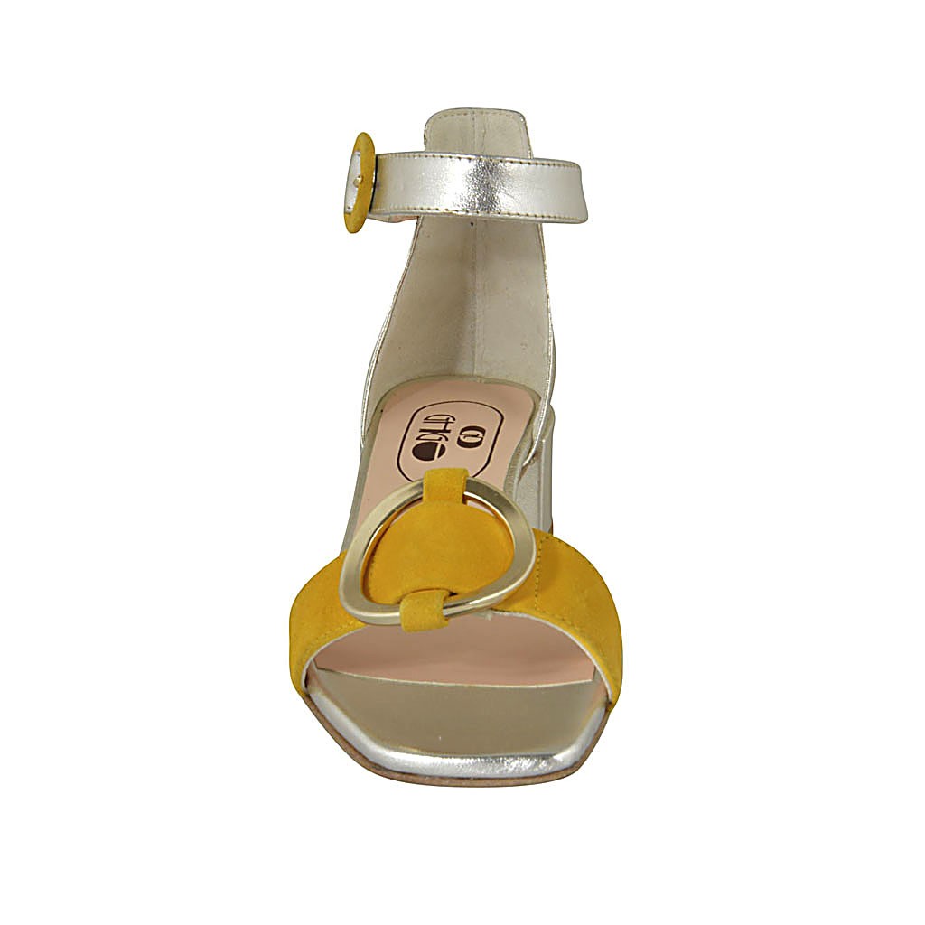 Woman's open shoe with accessory and strap in platinum laminated leather and yellow suede heel 4