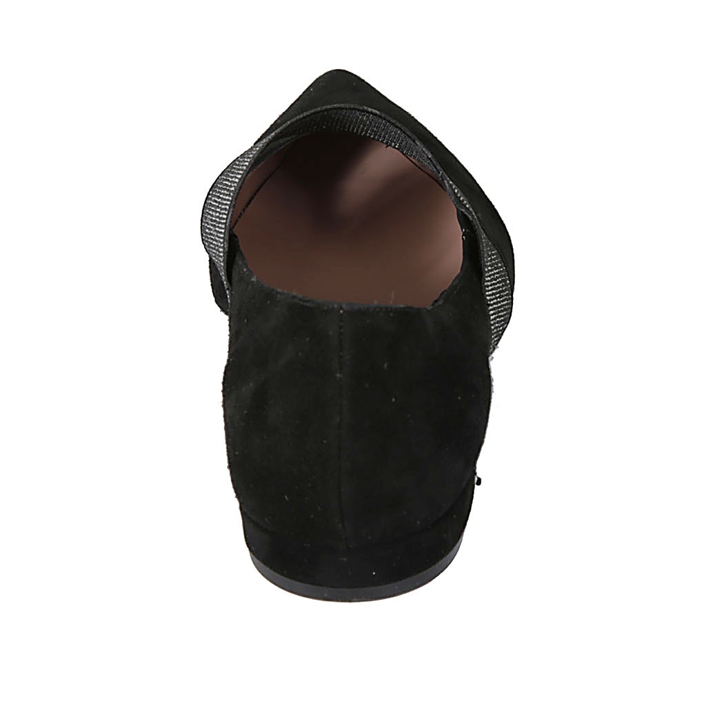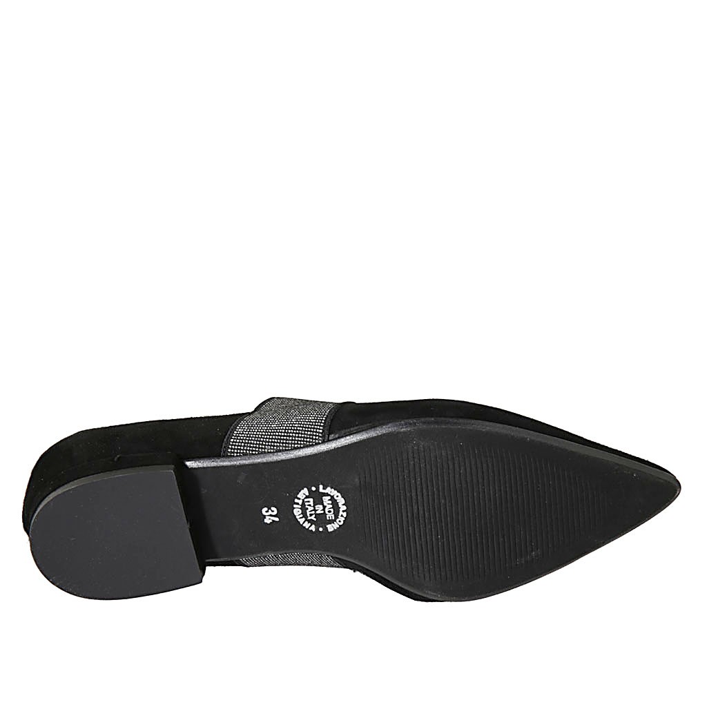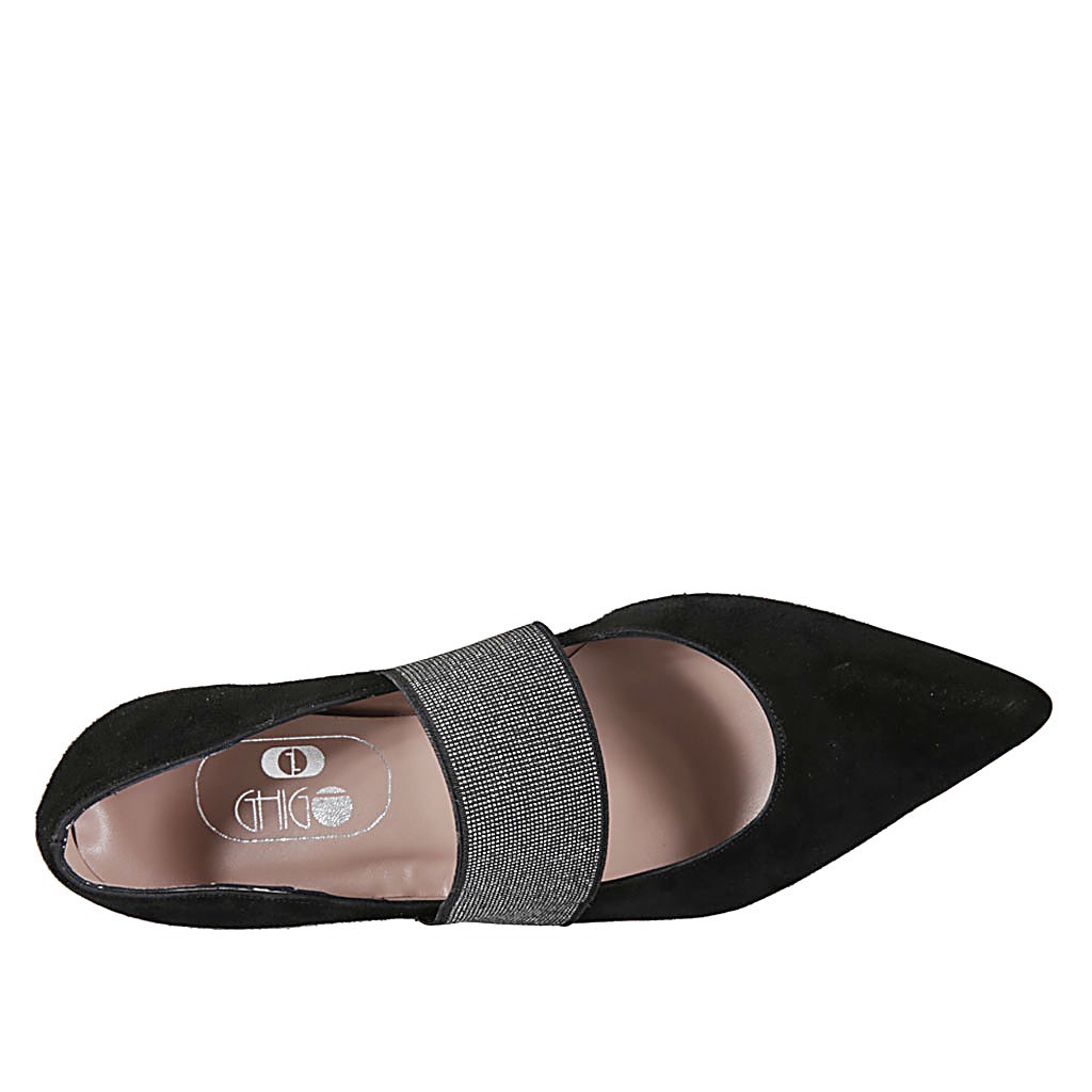 Bailerina puntiaguda para mujer con elastico brillante en gamuza negra tacon 1