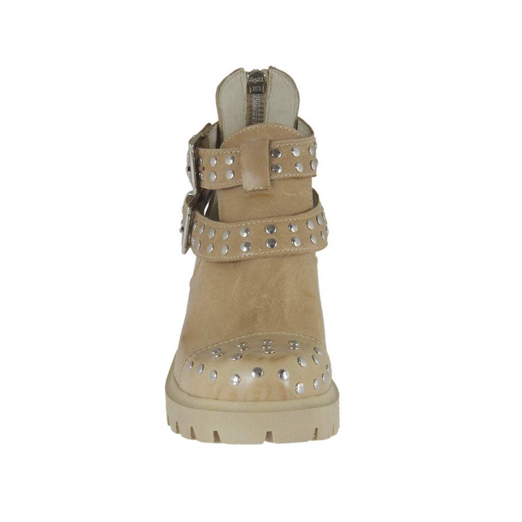 Botines para mujer con cremallera, hebillas y tachuelas, altura tacon 6 cm, en cuir beis, fondo en goma, forro en piel. Disponible en tallas grandes.