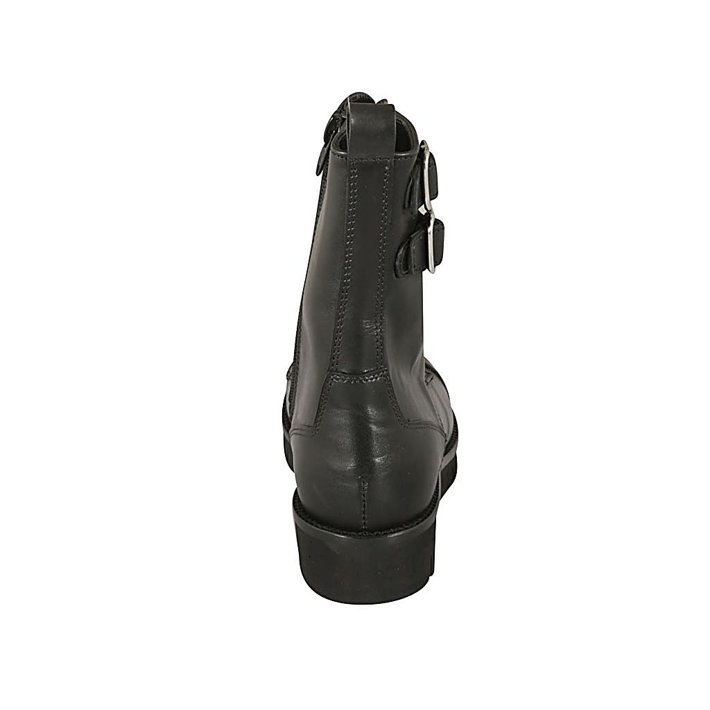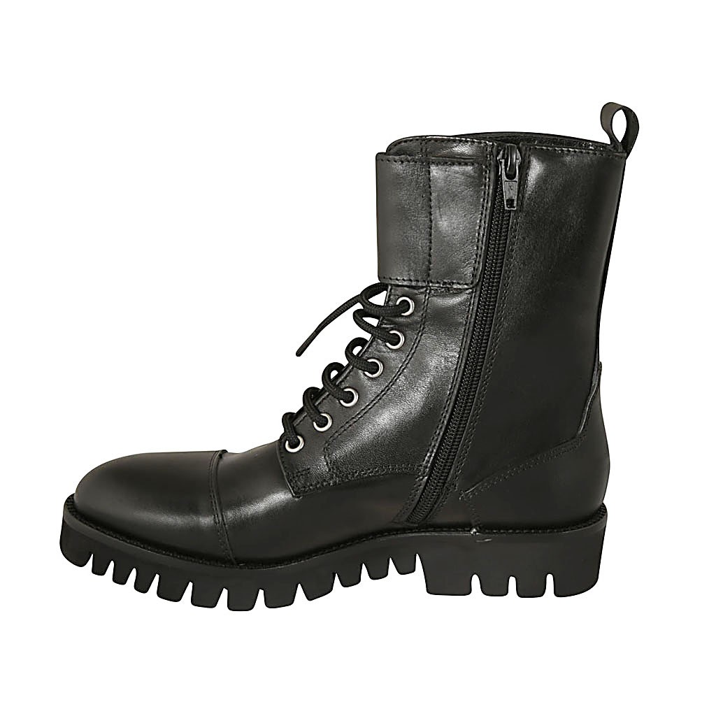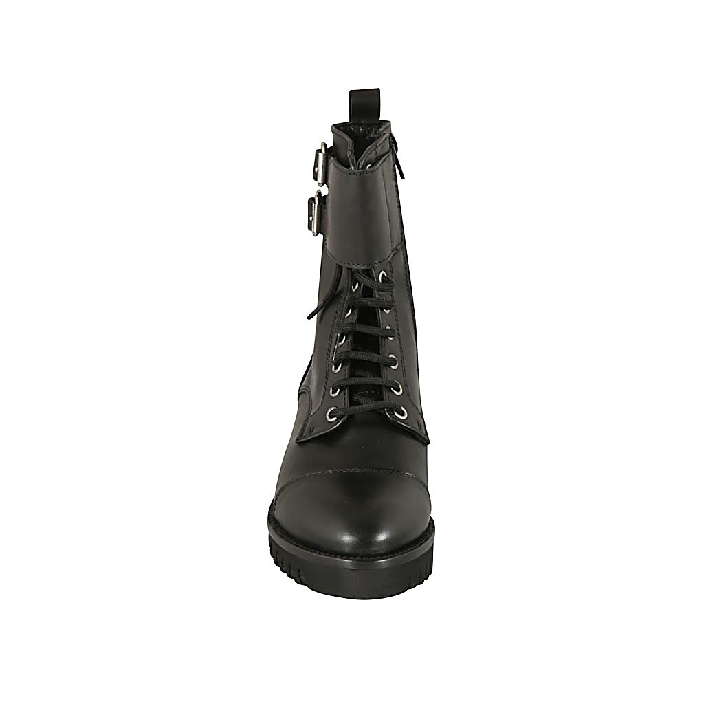 Botin para mujer modelo combate con cordones, puntera, hebillas y cremallera en piel negra tacon 3