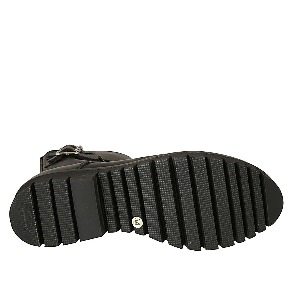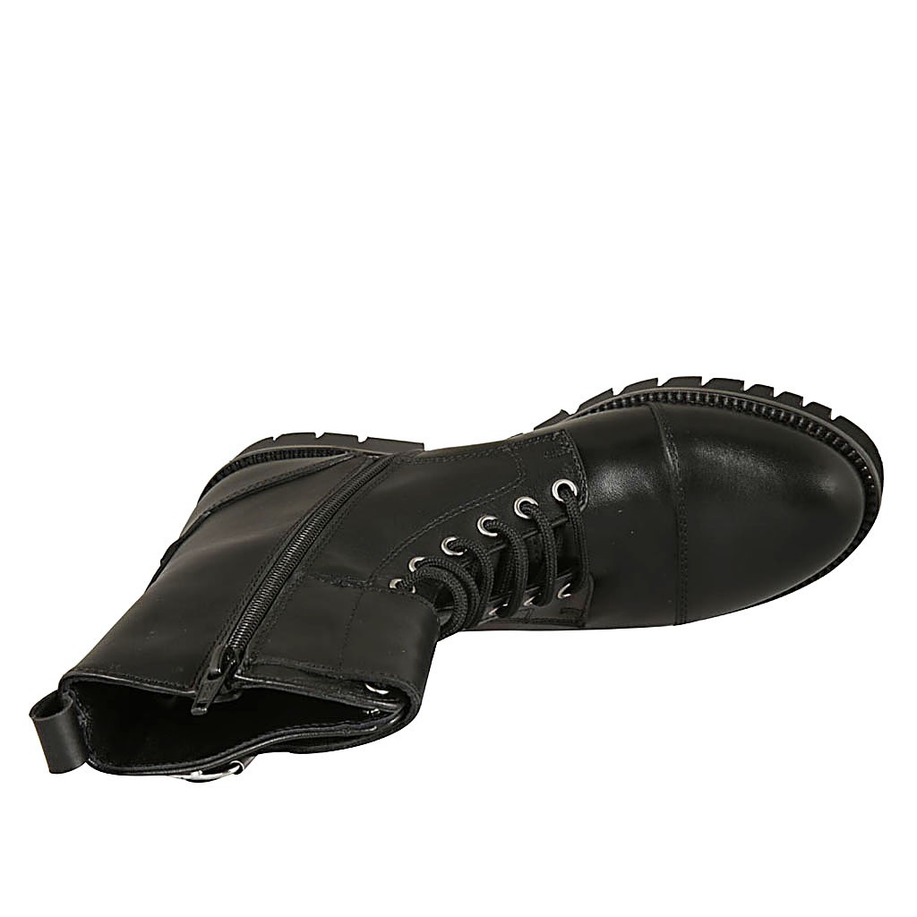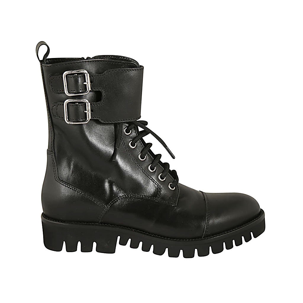 Botin para mujer modelo combate con cordones, puntera, hebillas y cremallera en piel negra tacon 3
