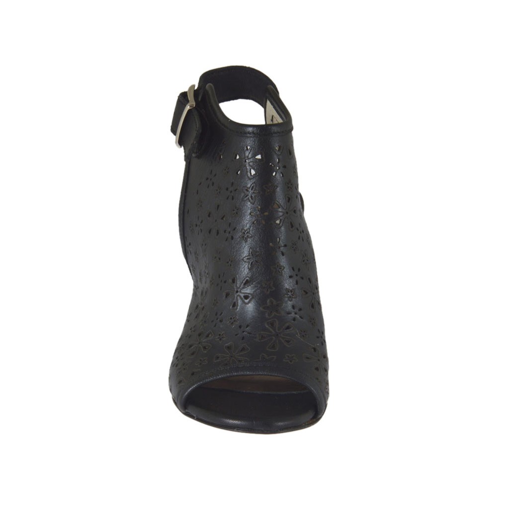 Sandalia con frontal alto para mujer, altura tacon 7 cm, en piel perforada de color negro, fondo en cuero, forro en piel. Disponible en tallas pequeñas y en tallas grandes.