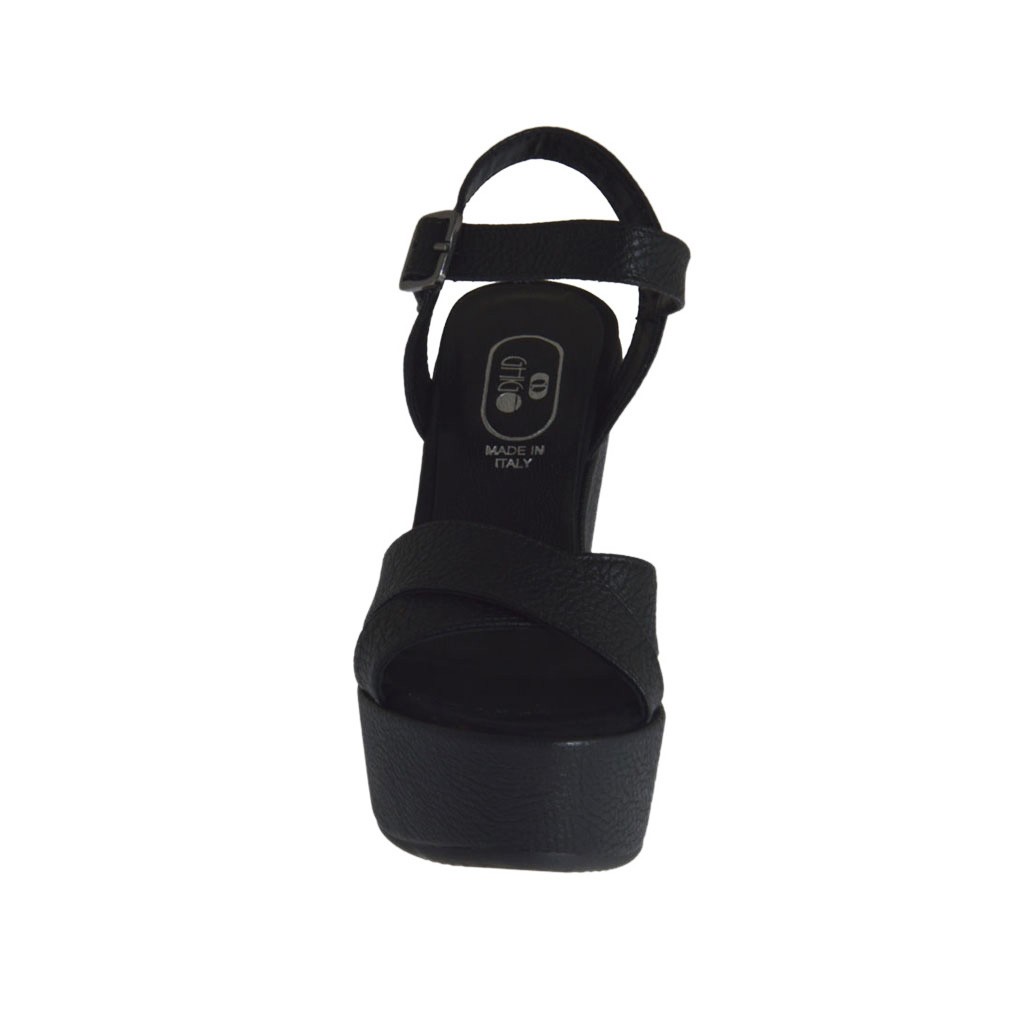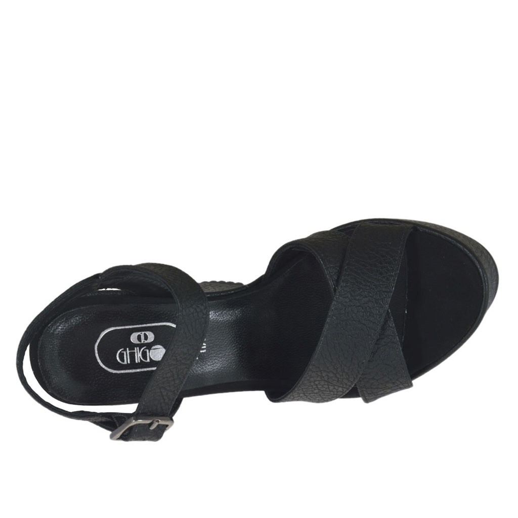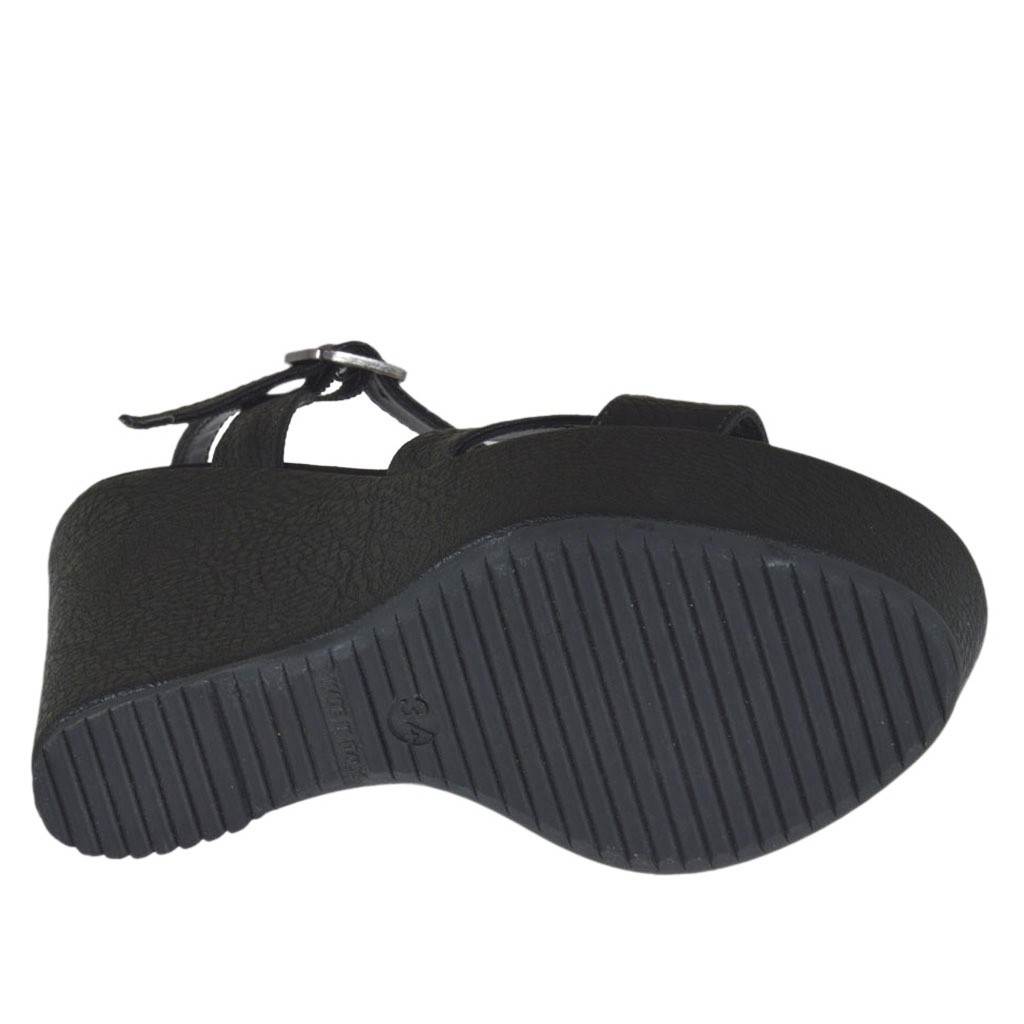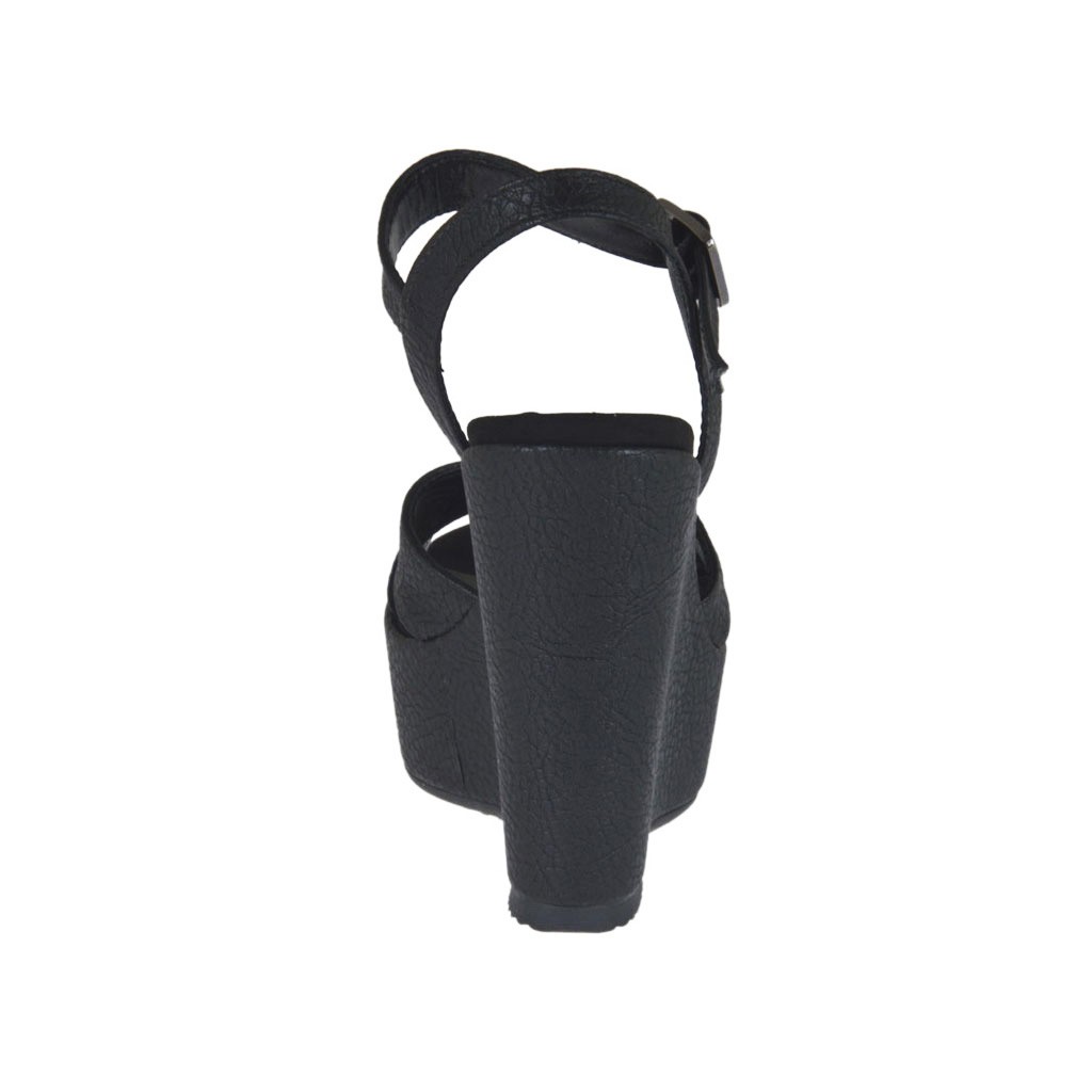 Sandalia para mujer imprimida negra con cinturon, plataforma y cuña cubierta, altura cuña 11 cm. y 4 cm. de plataforma, fondo en goma, forro en piel. Disponible en tallas pequeñas y en tallas grandes.