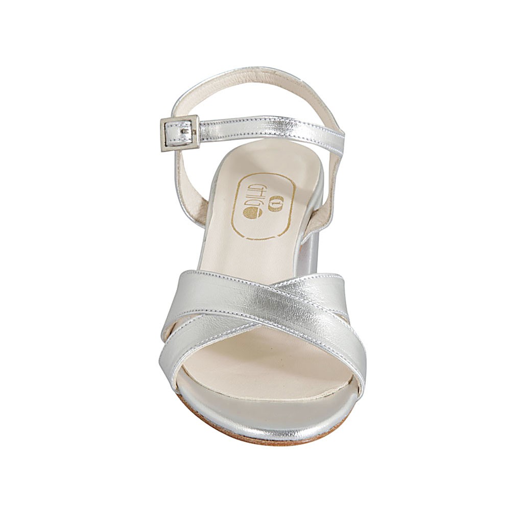 Sandalia para mujer en piel laminada plateada con cinturon tacon 5