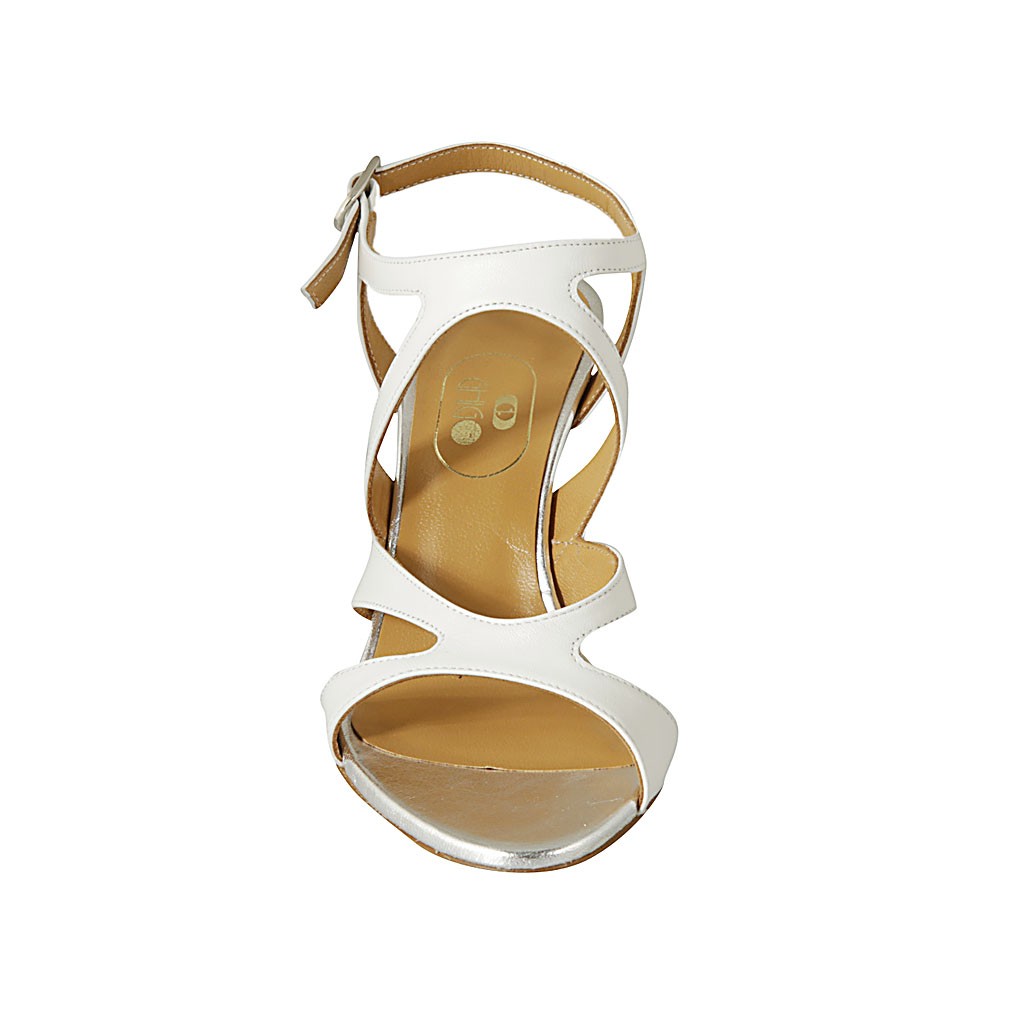 Sandalia para mujer con cinturon en piel blanca y plateada tacon 8