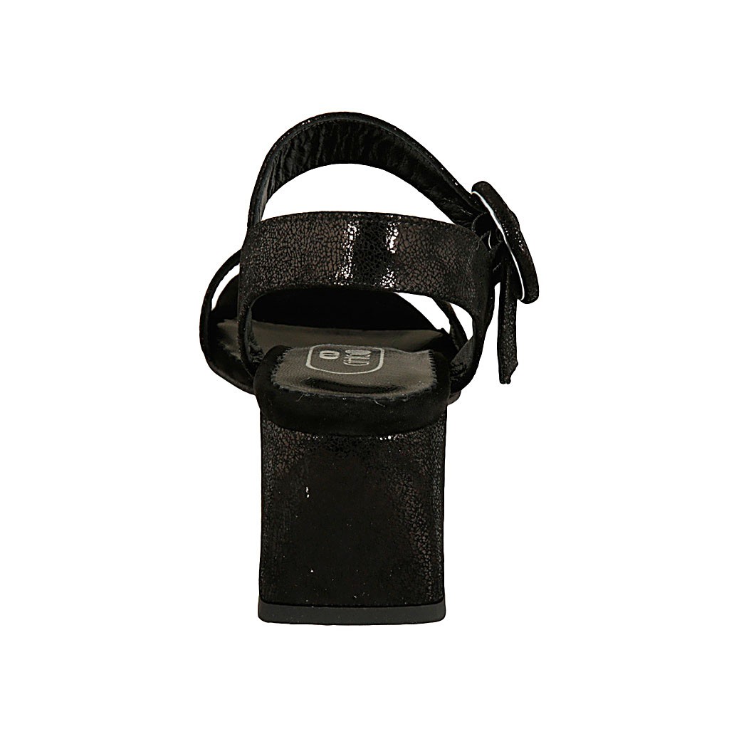 Sandalia con cinturon para mujer en gamuza laminada estampada negra tacon 5