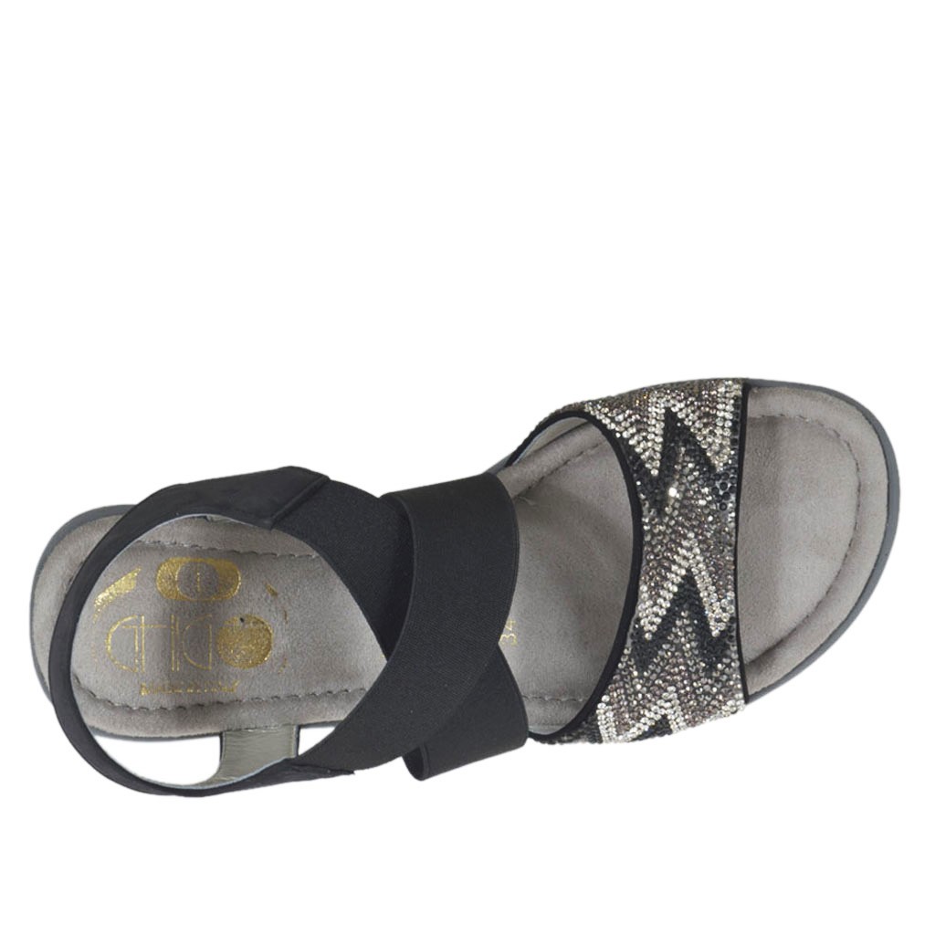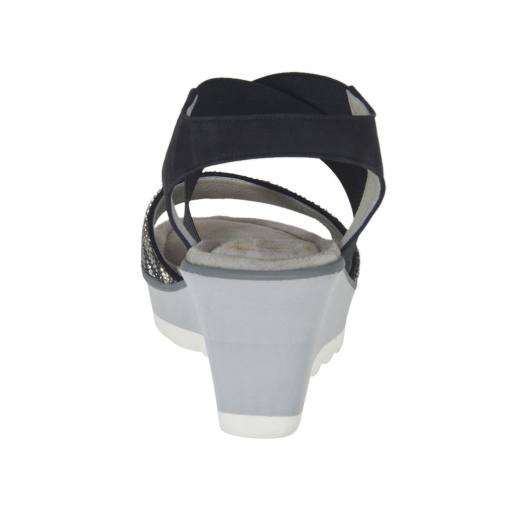 Sandalia para mujer con elásticos y estrass, altura cuña 6 cm. y 2 cm. de plataforma, en nubuk negro, fondo en goma, forro en piel. Disponible en tallas pequeñas y en tallas grandes.